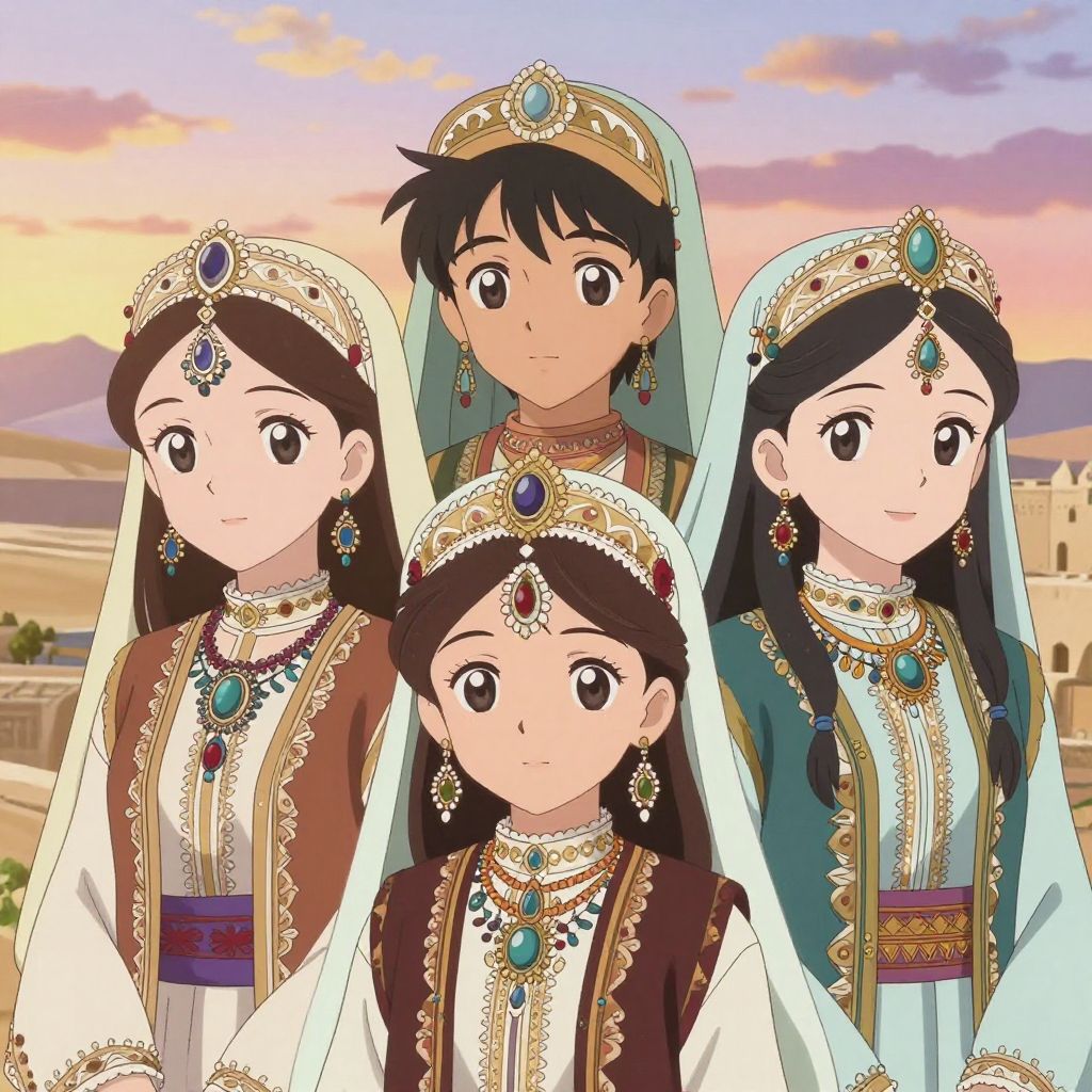Afghan anime characters depicted with traditional jewelry and accessories, soft pastel colors, detailed facial features, anime style, set against a backdrop of Afghan landscapes at sunset