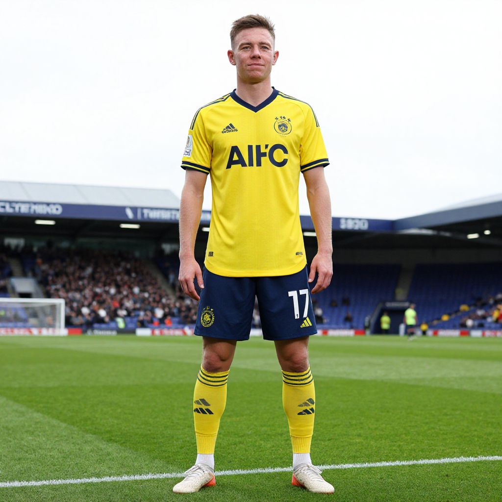 Photograph of a male soccer player standing on a green field, wearing a yellow jersey with "AFC" and black shorts, yellow socks, and