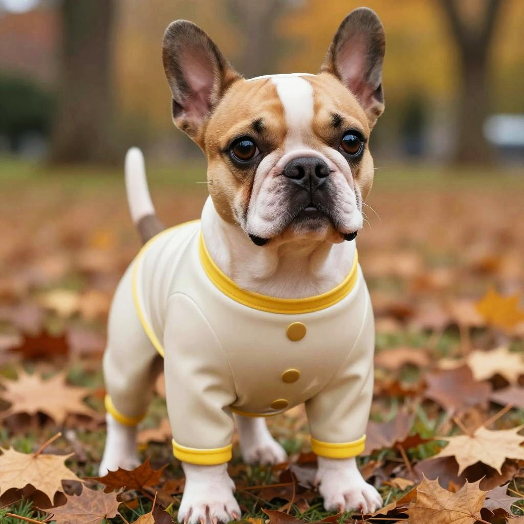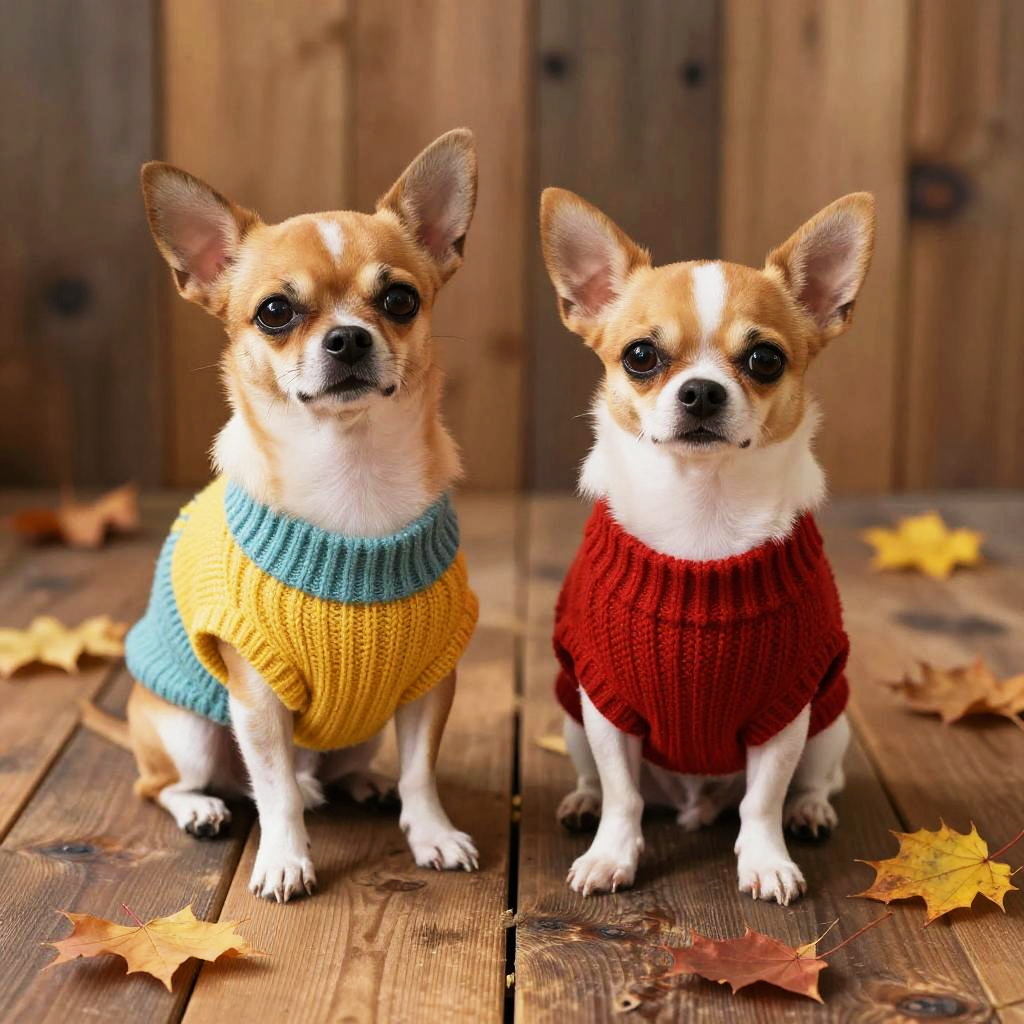 Chihuahua terrier mixes dressed in cute colorful sweaters, sitting on a rustic wooden floor with autumn leaves scattered around, charming and whimsical scene full of personality