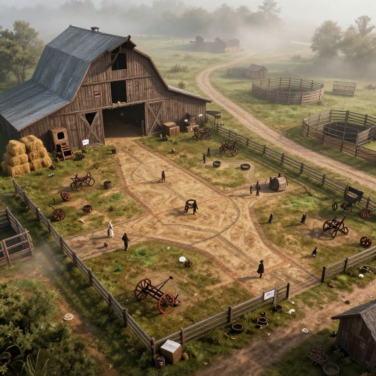 Photograph of a rustic farmyard with a weathered wooden barn, hay bales, scattered farm equipment, and small figures, surrounded by fences and