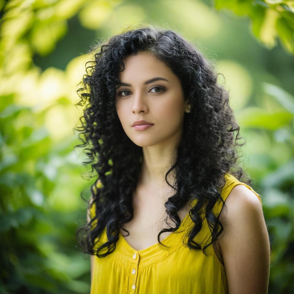 A moody portrait of a young woman with curly black hair wearing a yellow sundress standing in front of a blurred green leafy background, soft natural lighting, shallow depth of field