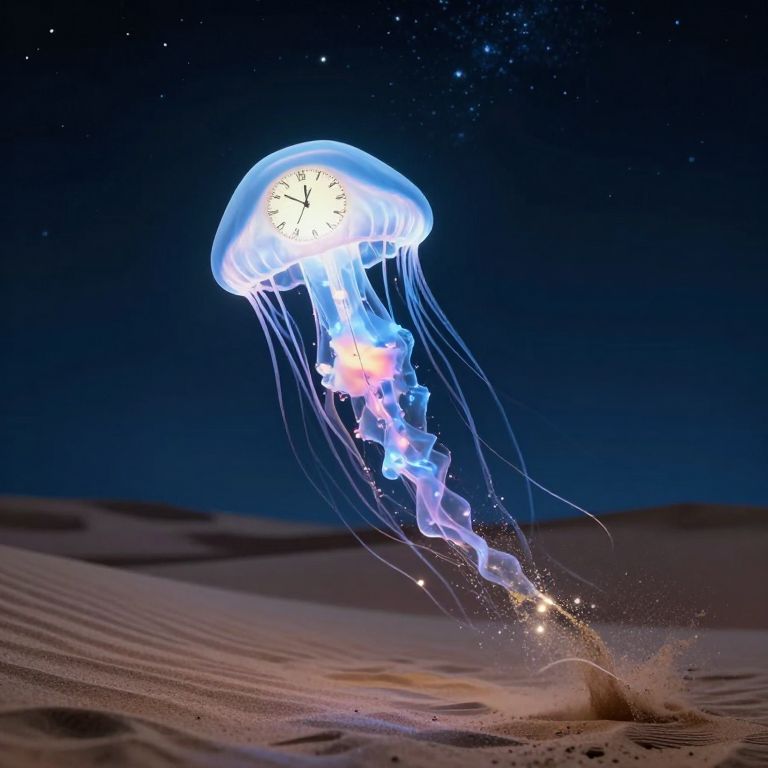 In a surreal digital artwork, a luminous jellyfish with a clock face as its bell floats serenely over a desert landscape, casting trails of sparkling sand that form intricate patterns against the starry night sky, blending fantasy and time in a dreamlike, high-definition illustration.
