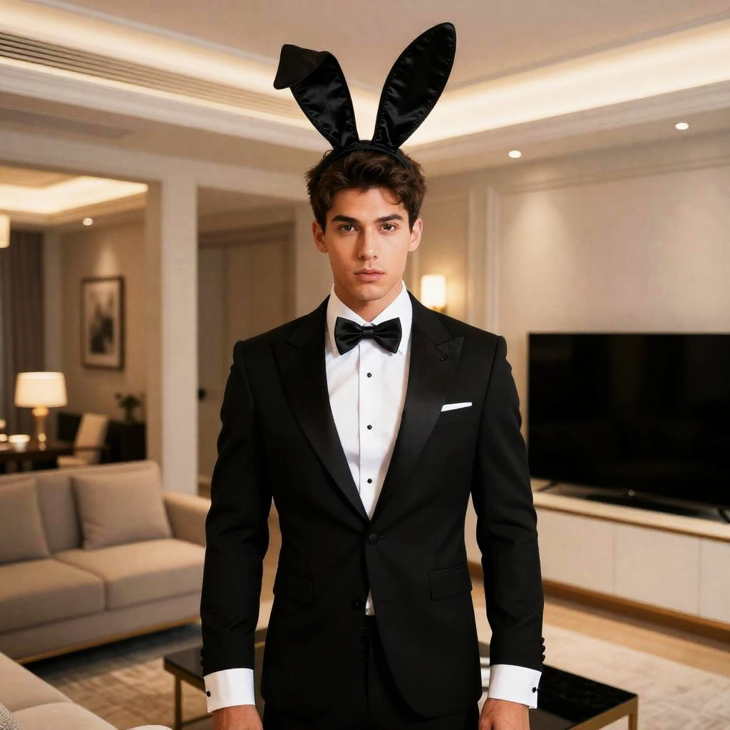 Realistic photo.a stylish figure wearing a classic Playboy bunny costume, with black satin bunny ears, white collar with bow tie, and fitted tuxedo cuffs, styled for a male look, in a luxurious penthouse suite realistic photo