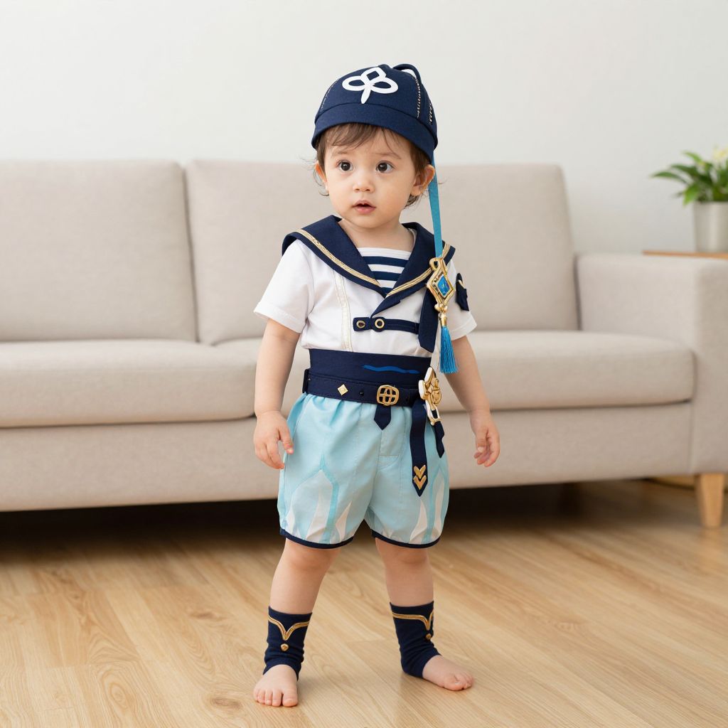 Toddler Genshin Impact Outfit Costume, baby standing on a wooden floor in a room