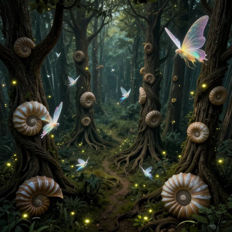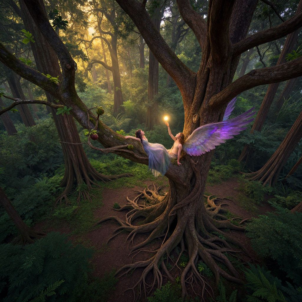 A mesmerizing digital artwork depicts a magical scene in a dense, flourishing forest where towering ancient trees create intricate patterns on the forest floor with their gnarled roots. From an overhead view, observe a captivating young woman adorned with ethereal wings resting on one of these majestic trees, delicately plucking a luminous celestial fruit from its twisted branches. The color palette transitions harmoniously from deep emerald greens and rich browns in the shadows to radiant golds and violets in the sunlight filtering through the canopy, creating an emotional spectrum that juxtaposes serenity with awe-inspiring wonder in this captivating masterpiece.