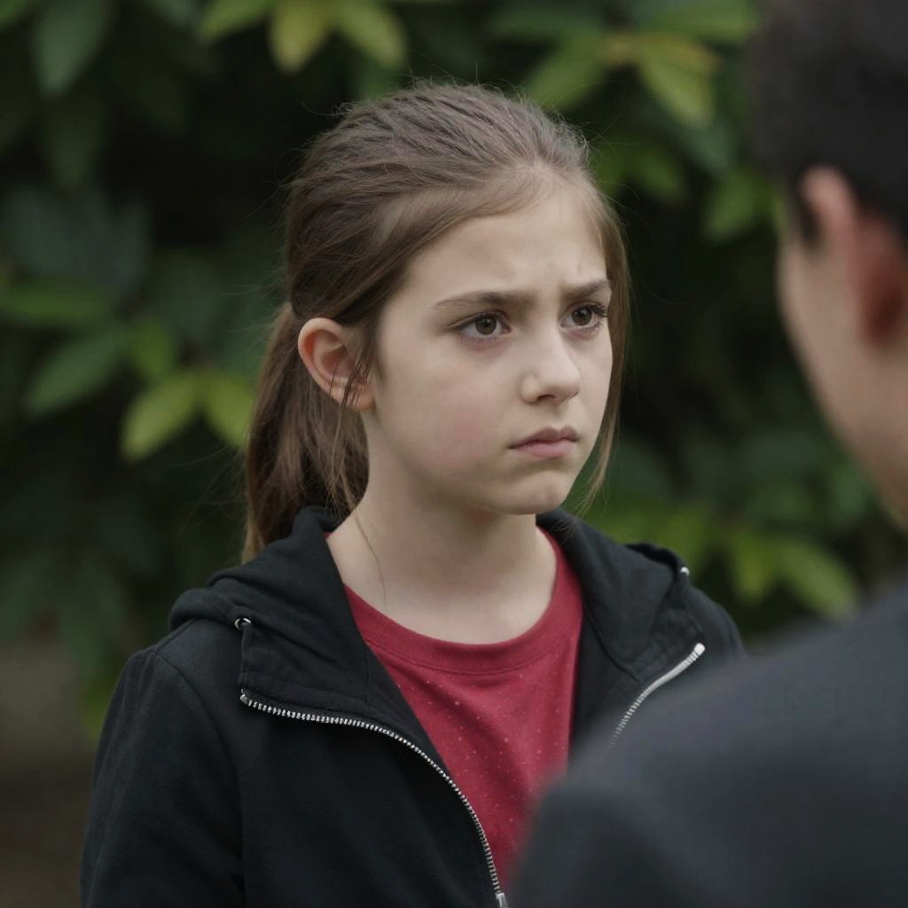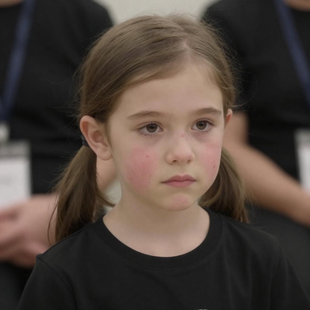 Photograph of a young girl with light brown hair in pigtails, wearing a black outfit. She has several small, red acne marks on her face, slightly flushed cheeks, and a neutral expression. Blurred background with adults in dark clothing. Upper body shot, focused on her face.
