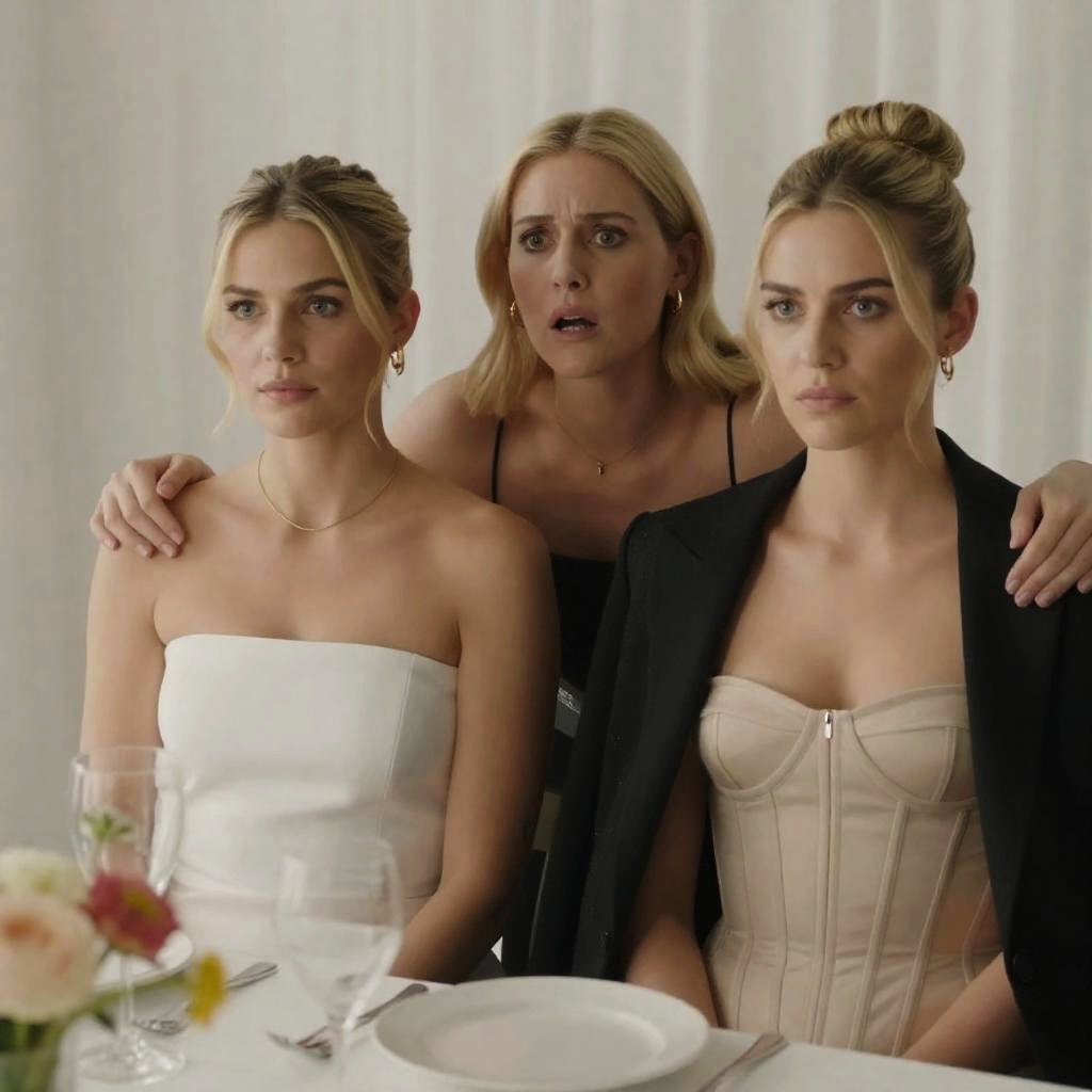 Photograph of three women at a formal table. Blonde woman on left, white strapless dress, neutral expression, holding glass. Middle woman, blonde, shocked expression, arms around shoulders. Right woman, blonde, bun hairstyle, black jacket, strapless beige corset, intense gaze. Table with glasses, flowers, and white tablecloth. Background: white curtains.