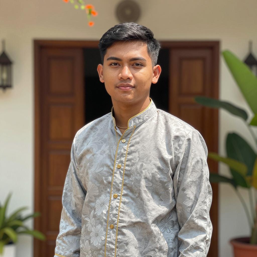 Pakistani traditional male, photograph of a young South Asian man with medium brown skin and black hair, wearing a dark brown traditional kurta with intricate gold and purple embroidery on the right side, standing in an outdoor setting, background shows a blurred building with arched windows and a man in white attire, natural light, serious expression, short beard, neat hairstyle, street setting