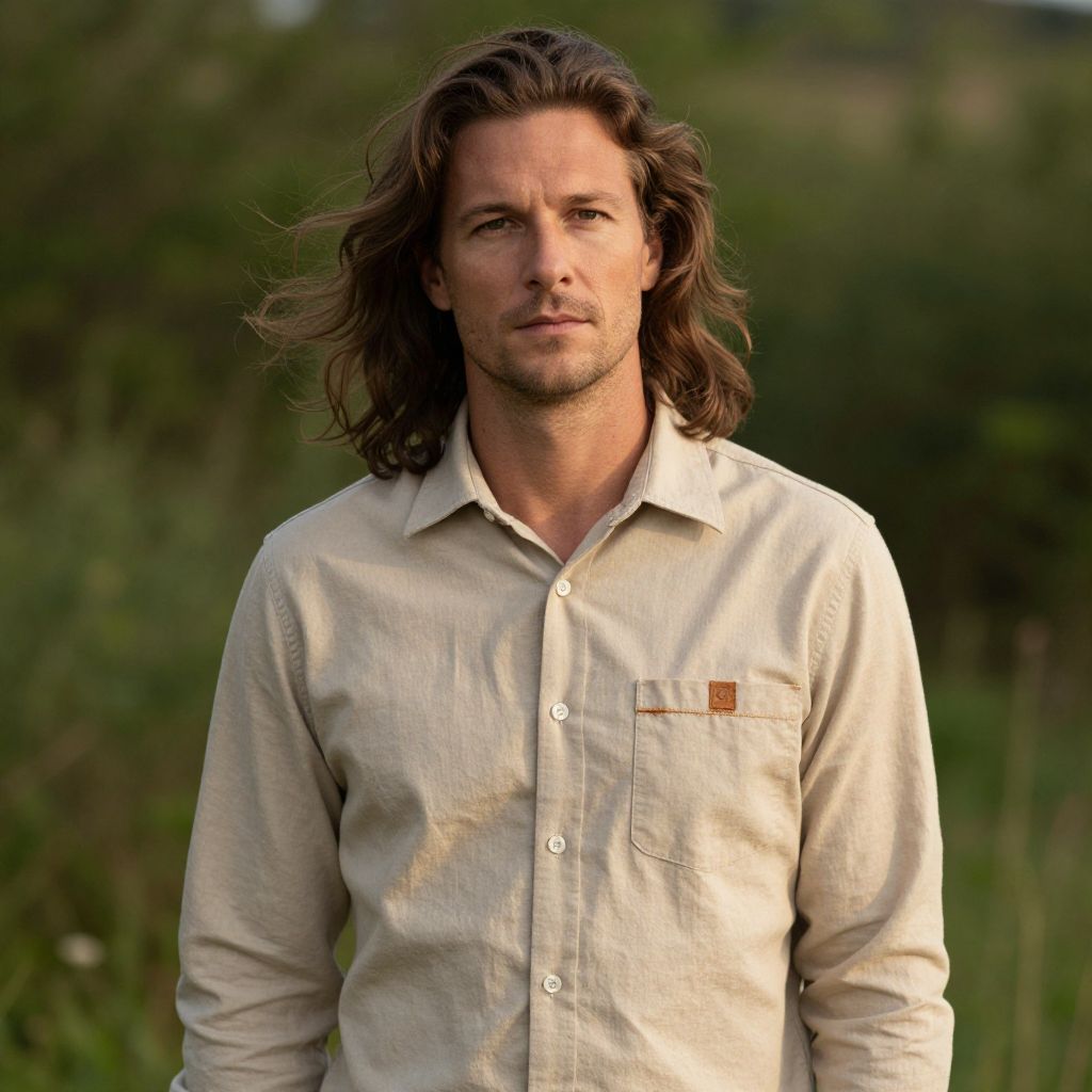 A man with long, wavy brown hair, gently tousled by the breeze, is wearing a well-fitted beige button-down shirt with a small, slightly worn pocket on the front. He stands confidently in front of a soft, lush green background, which subtly suggests a natural outdoor setting like a garden or meadow. The lighting is warm and natural, casting gentle shadows, and the overall atmosphere is calm and serene.