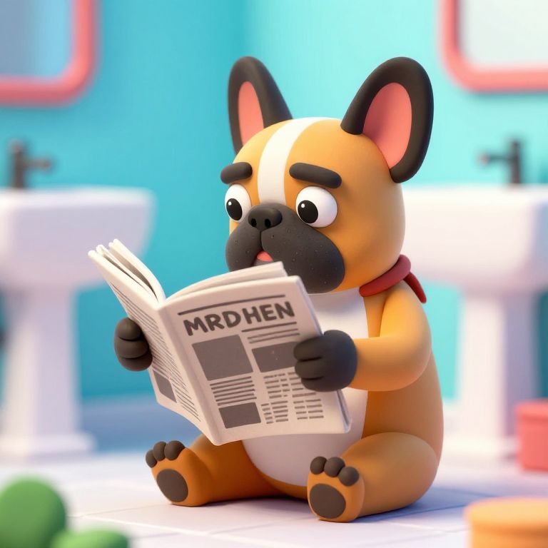 Stop-Motion Animation colorful popart style frenche bulldog sitting in the bathroom reading a newspaper,