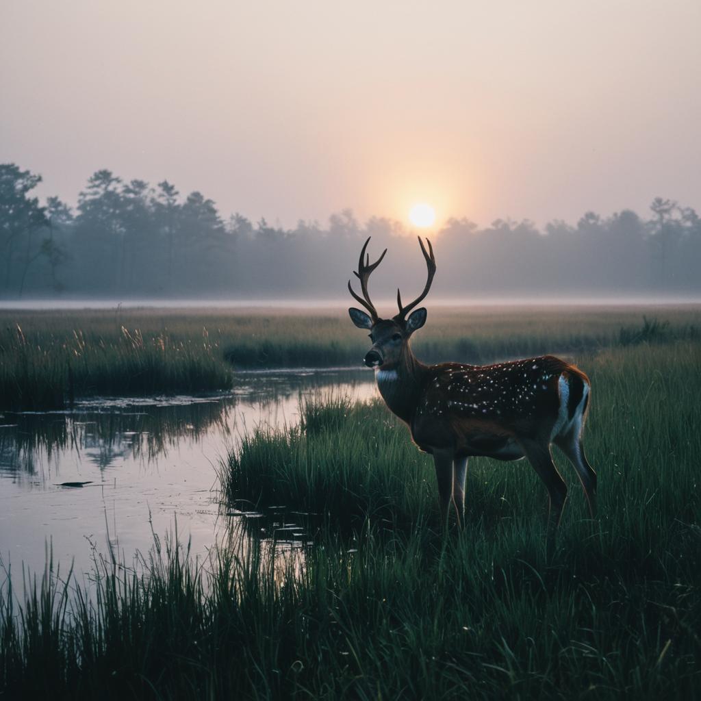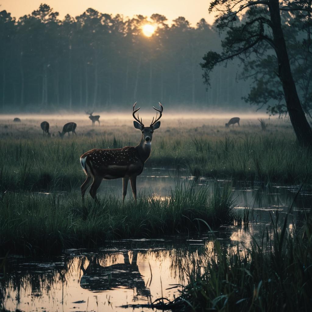 Deer in Misty Swamp at Sunset