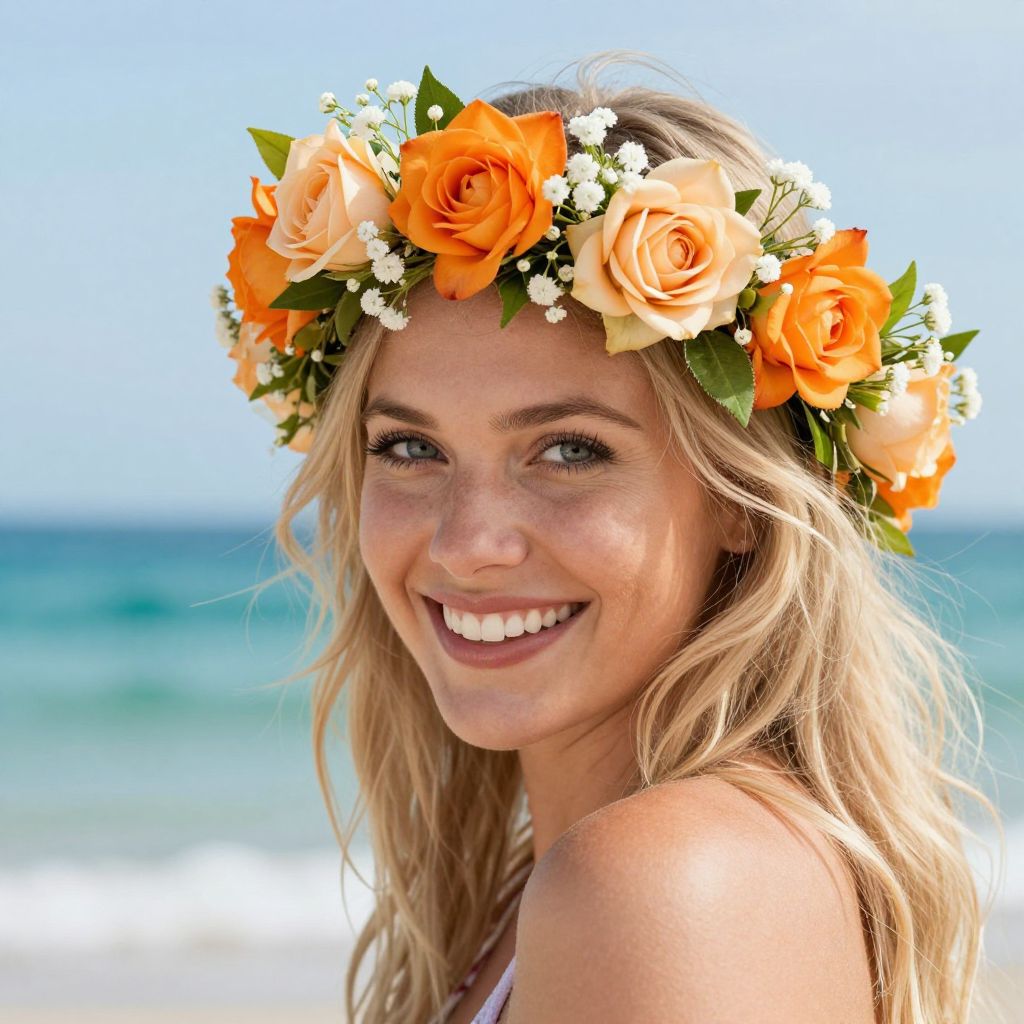 Photograph of a smiling blonde woman with a floral crown of orange roses, white daisies, and green leaves, standing on a sunny beach with
