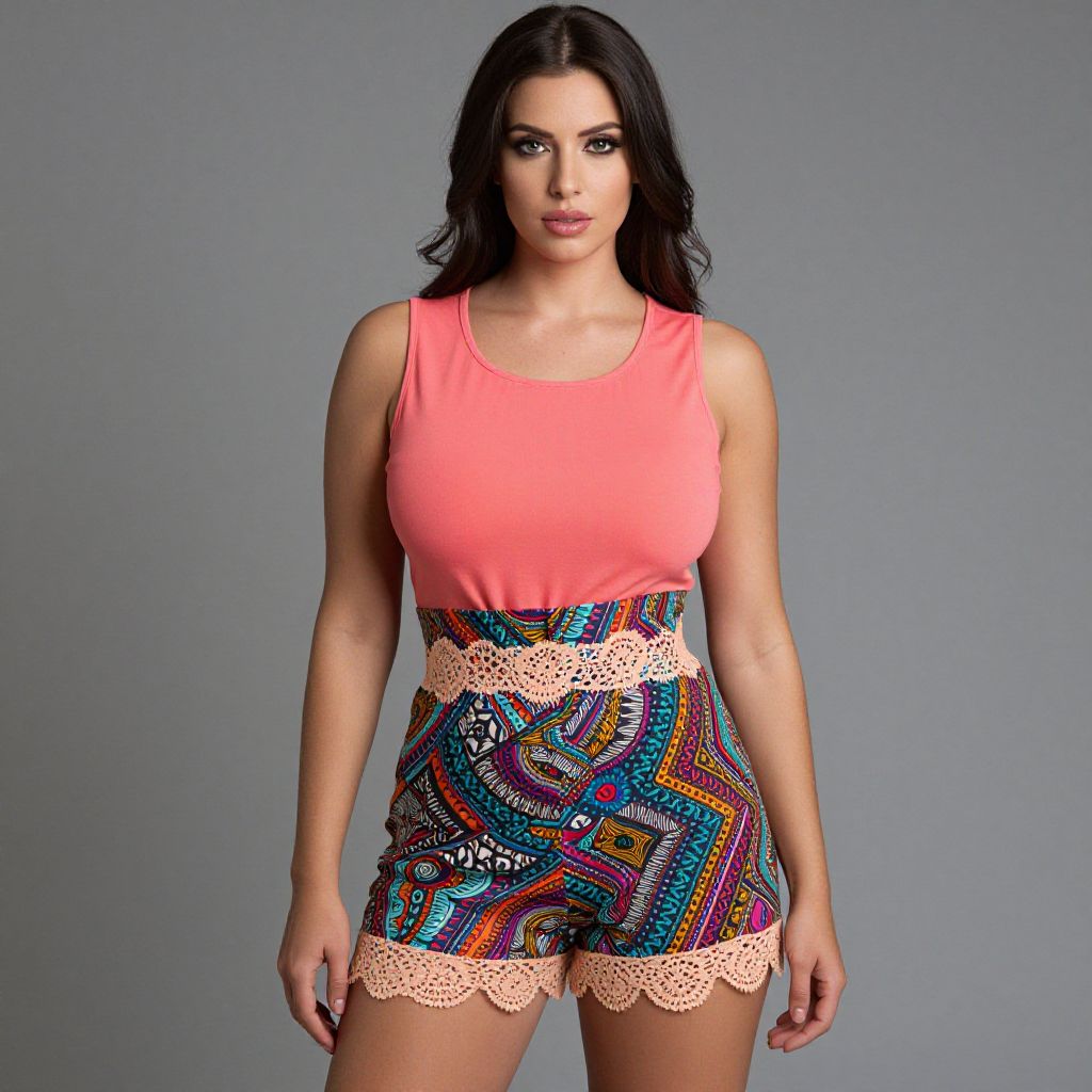 "Woman, vibrant, crop top with sheer black mesh panel, high-waisted bodycon skirt, brightly colored tribal-inspired patterns, knee-length, clear high-heeled sandals, gold cuff bracelet.. Sexy. Pretty face and beаutiful eyes. Big breasts."