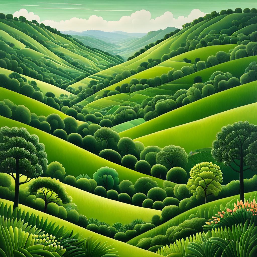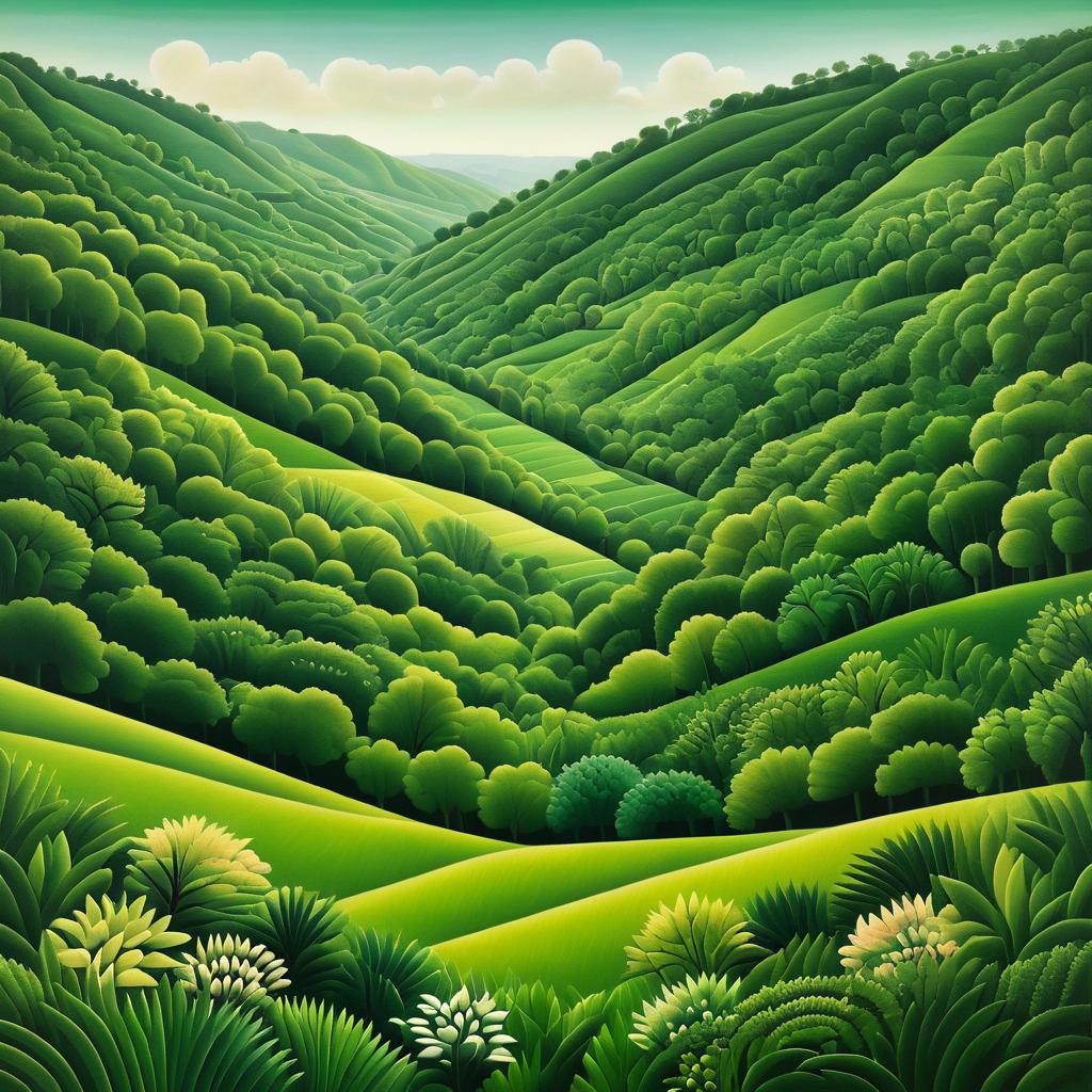 Detailed illustration of lush green valleys in spring by Henri Rousseau, showcasing a serene landscape.