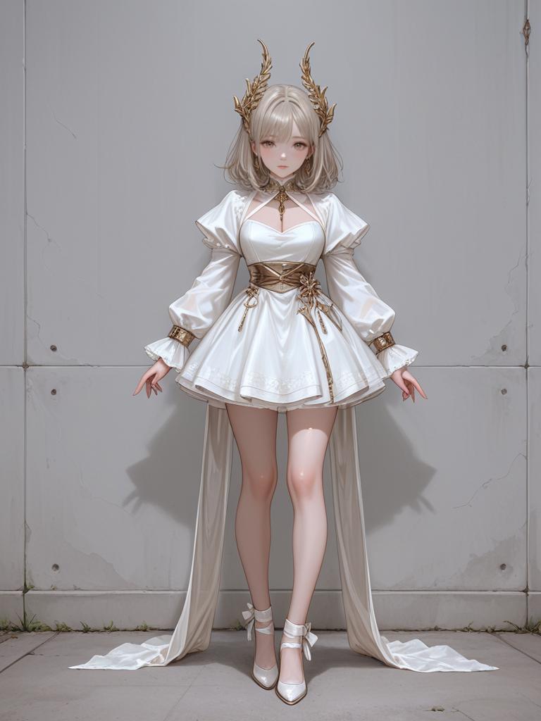 This is a digital anime-style drawing of a young woman with light gray, shoulder-length hair and pale skin. She has golden, horn-like headpieces and is dressed in a white, medieval-inspired dress with long, puffed sleeves and a gold-trimmed waistband. The dress has a short, flared skirt that exposes her legs, and she wears white, ankle-strap sandals. She stands against a plain, gray, metallic wall with her arms slightly outstretched and a gentle, serene expression on her face. The image has a soft, pastel color palette and a slightly glossy texture.