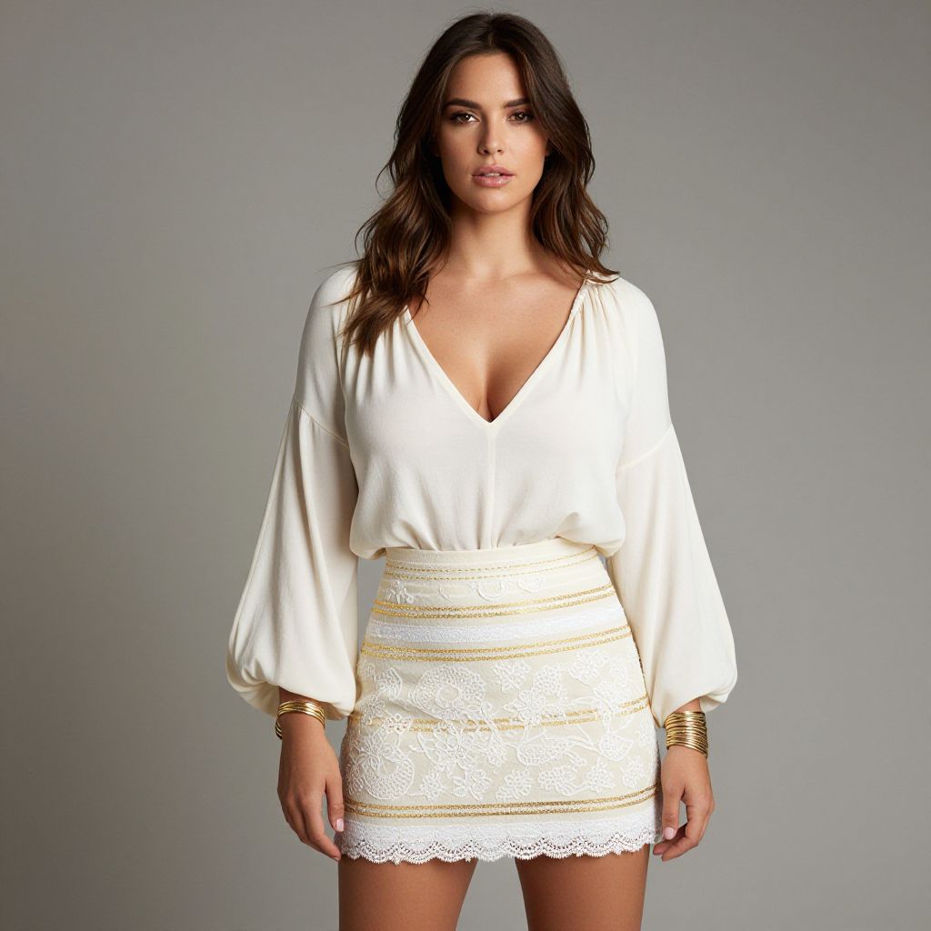 Photograph of a young woman with long, wavy dark brown hair and light olive skin, standing against a plain gray background. She wears a white, deep V-neck blouse with long, puffed sleeves and a high-waisted, lace-embellished white mini skirt. Her makeup is subtle, accentuating her natural features. She has a confident expression, looking directly at the camera. She accessorizes with gold bracelets on her right wrist. The overall style is chic and elegant, with a focus on white and gold tones. The lighting is even, highlighting the textures of her blouse and skirt.