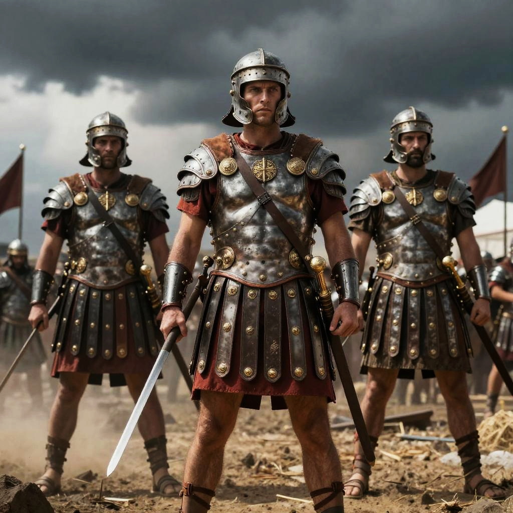 Romanos warriors in detailed ancient armor, standing on a battlefield, intense expressions, dynamic poses, realistic textures on metal and leather, epic stormy sky background, high contrast, cinematic lighting