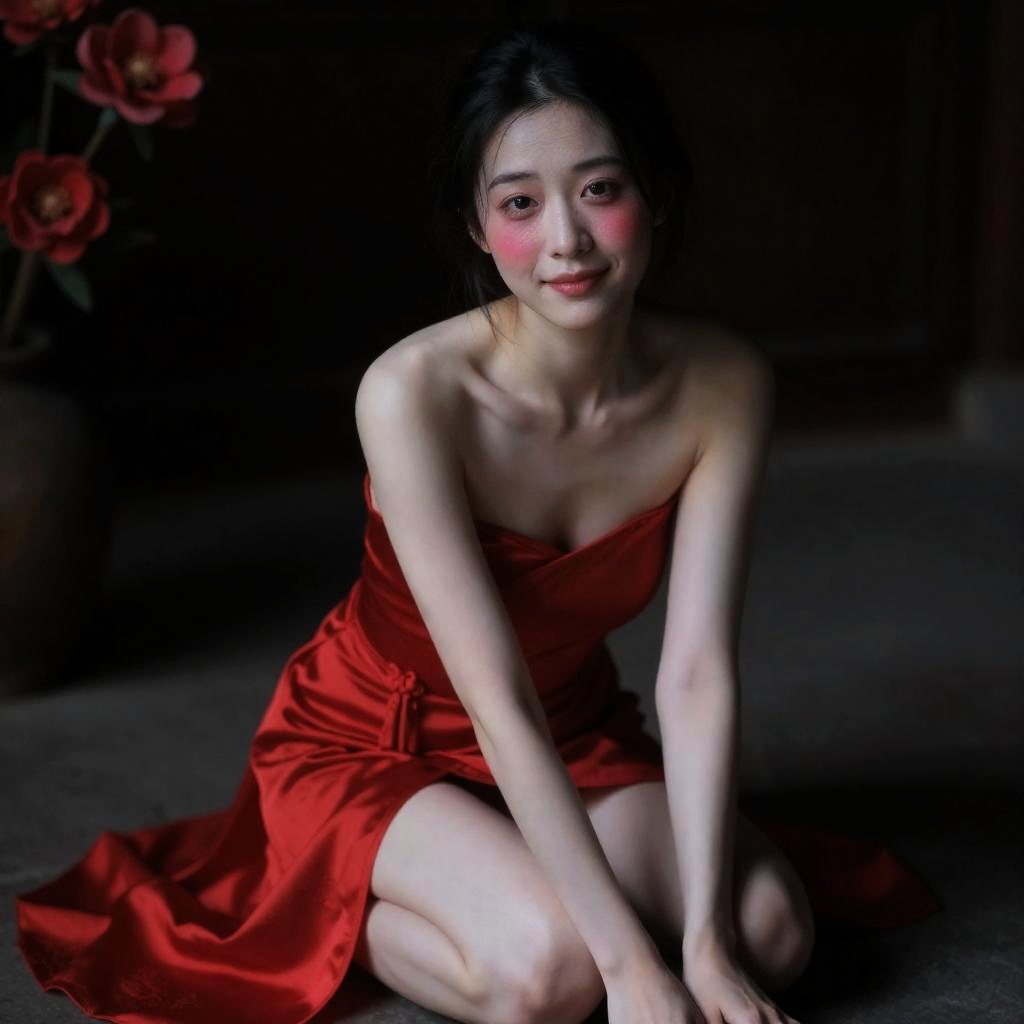 Portrait of a young East Asian woman with pale skin wearing a strapless red satin dress. She is seated on the floor with knees bent, looking directly at the camera with a warm smile and flushed cheeks. The setting is dimly lit with deep shadows and soft focus, emphasizing her delicate facial features. Red flowers are visible in the dark background, adding to the artistic composition.