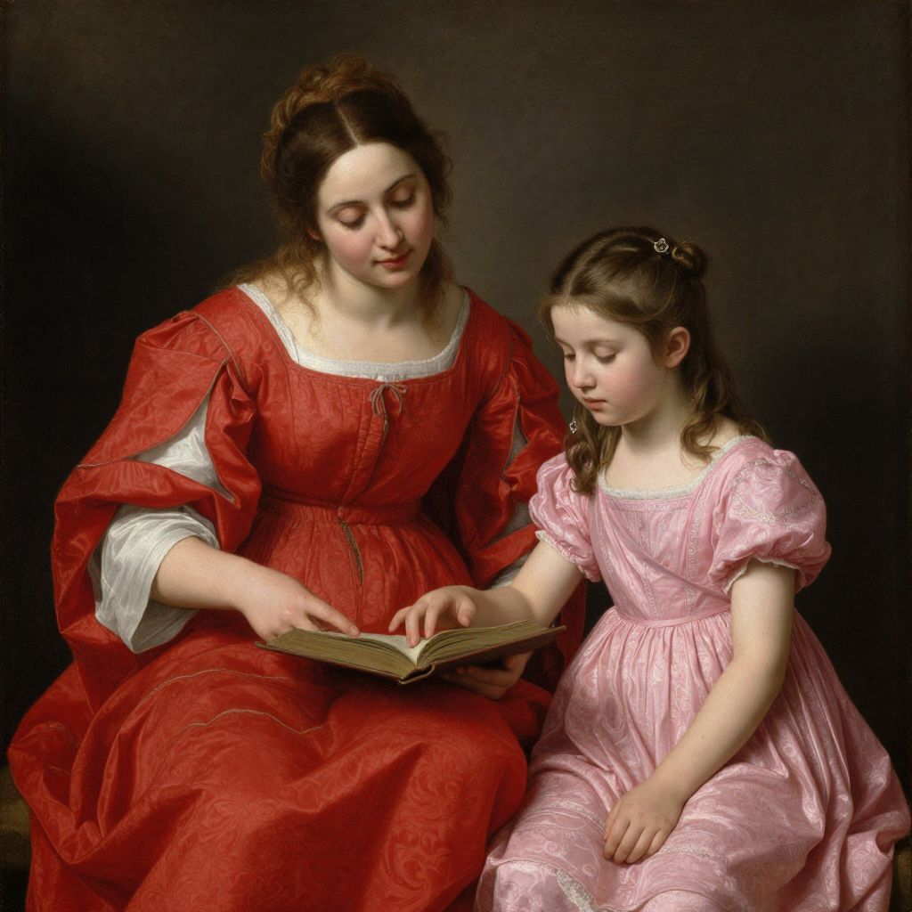 A photograph-style digital painting depicts a fair-skinned woman with brown hair in a red dress with white sleeves, seated beside a fair-skinned girl with dark brown hair in a pink dress. The woman, with a gentle expression, points at an open book they both gaze at. The girl, sitting to her right, looks down at the book with a calm expression. The background is dark, highlighting the subjects. The woman's dress has a subtle floral pattern, while the girl's dress is simpler with small puffed sleeves. The painting has a classical, realistic style.