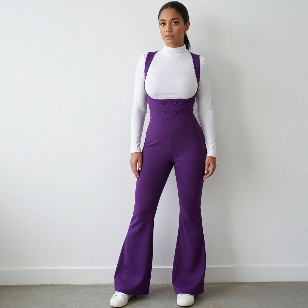"Woman, contemporary chic, purple jumpsuit with flare-legged design, sleeveless, fitted waist with button detailing, layered over a white high-neck long-sleeve top, casual white sneakers, hair tied back, minimalist jewelry with small earrings, posing in a simple indoor setting with a plain white background.. Sexy. Pretty face and beаutiful eyes. Big breasts."