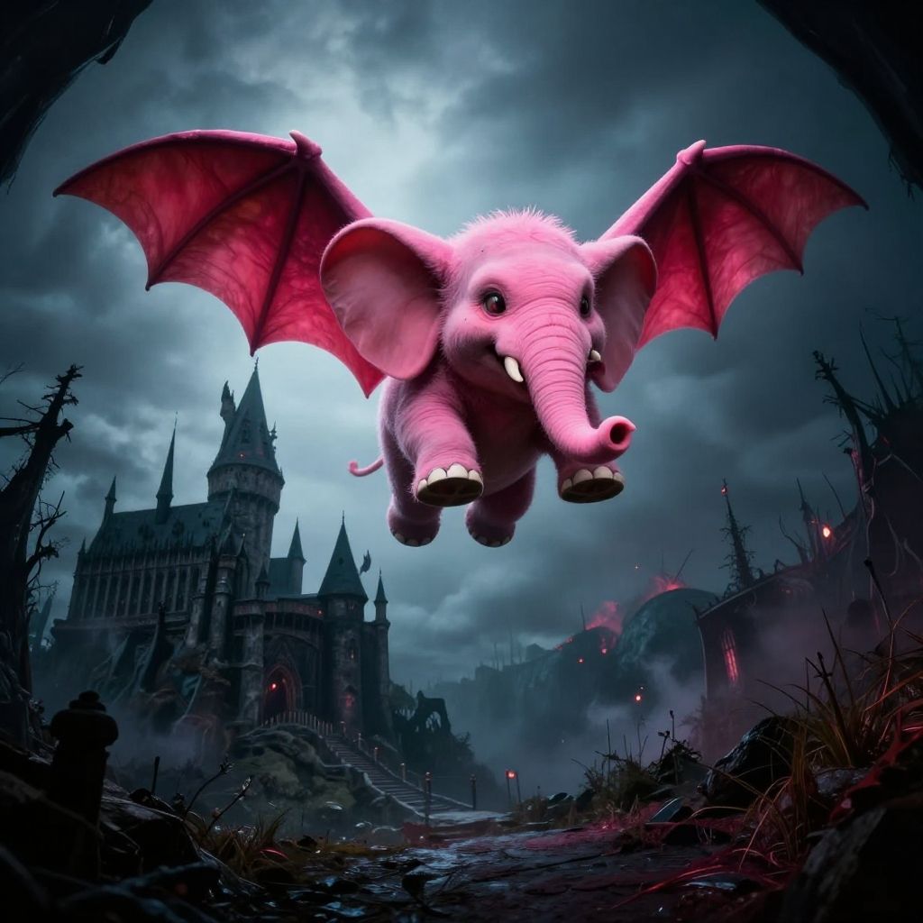 Digital artwork of a pink, bat-winged, flying elephant with large tusks over a dark, gothic castle landscape under a stormy sky.