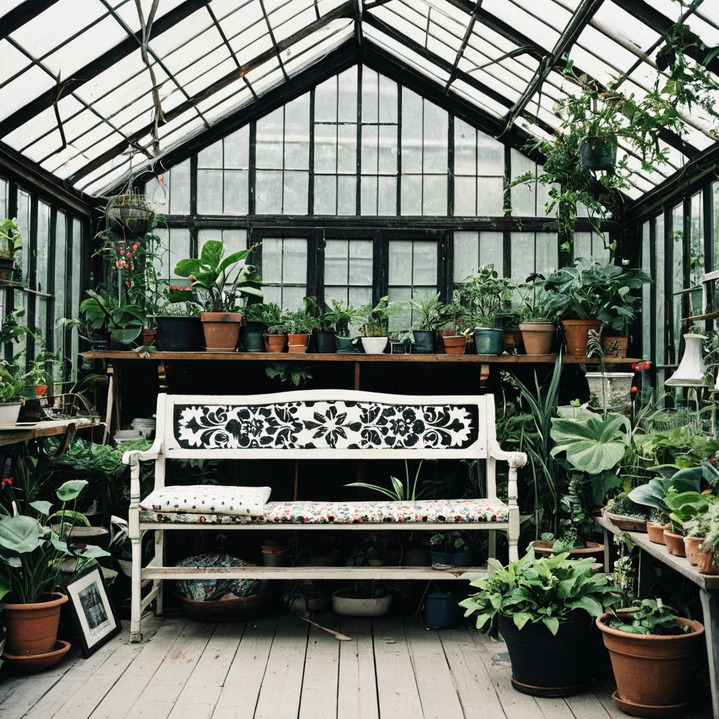 Interior view of an intricate botanical greenhouse featuring an antique white wooden bench with floral patterned cushions, surrounded by various potted plants and hanging greenery. The greenhouse has large glass walls and roof panels allowing natural light to illuminate the lush green foliage and rustic wooden flooring.
