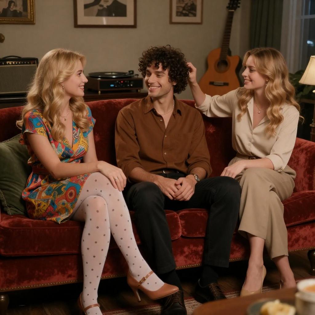 Acoustic band performing Christmas carol. Five musicians, red curtains, decorated Christmas tree. Female singer with blonde hair, blue jacket, microphone, singing. Male guitarist with dark hair, leather jacket, playing. Bassist in grey suit, looking down. Drummer in plaid shirt, holding drumstick. Female vocalist with black hair, black top, standing. Audience seated, facing performers. Warm lighting, string lights above.