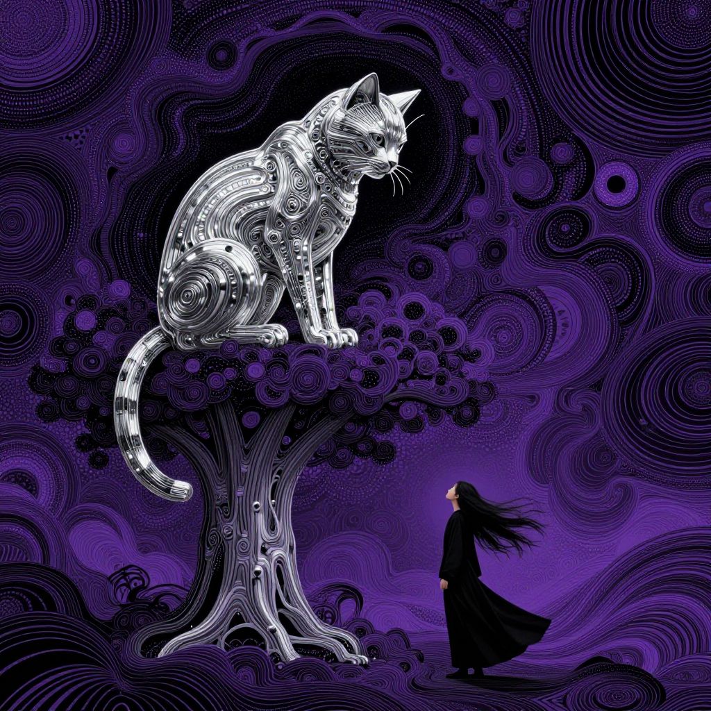 Ancientstyle, abstract digital art, a giant cat made out of pure shining silver metal sits on a large tree looking down, A small woman in black robes looks up at the cat her long black hair flowing in the wind, Intricate dot and line patterns, purple and black background, wavy patterns, surreal, hypnotic, otherworldly, fluid motion, high contrast, minimalistic, dark background, vibrant colors, psychedelic, low-angleview