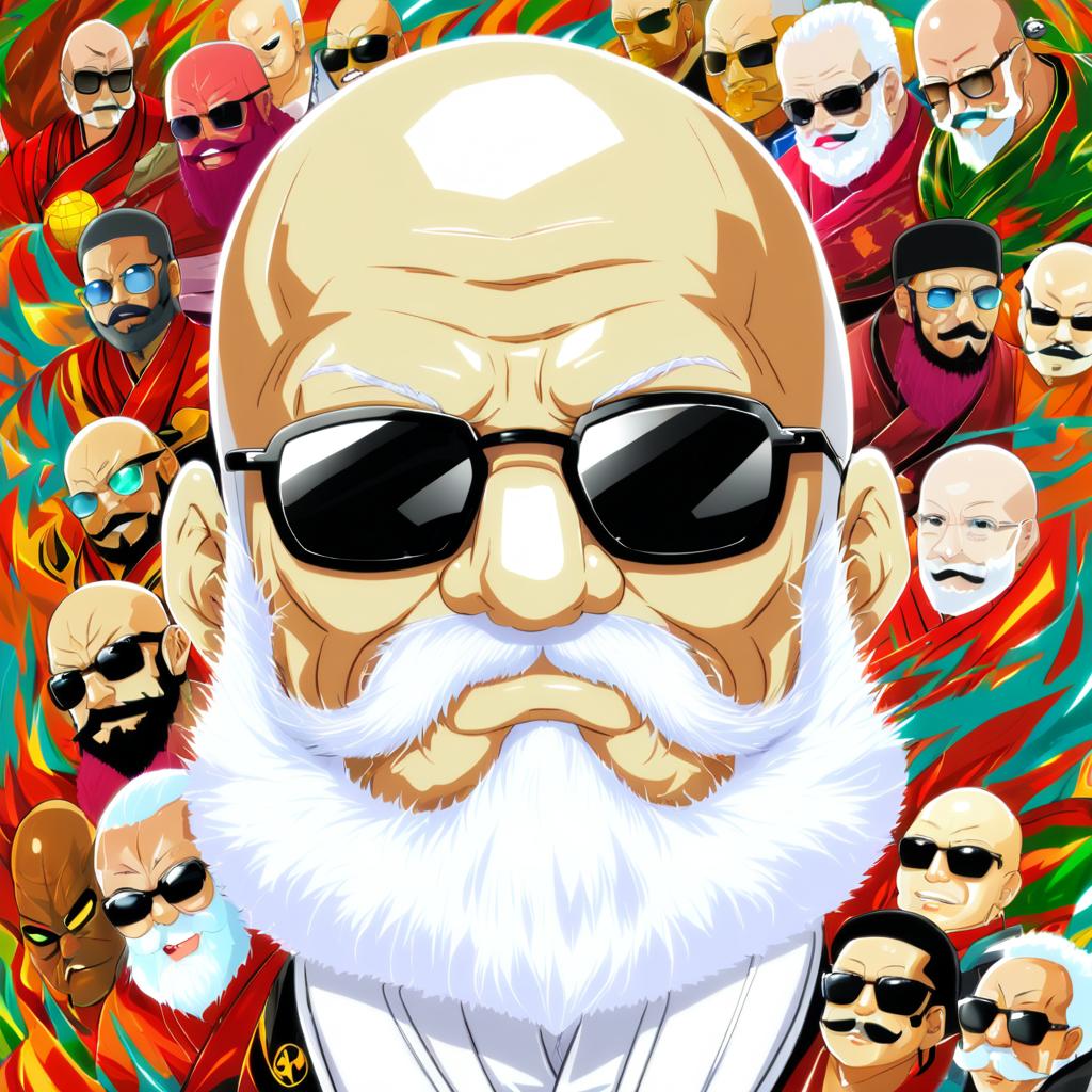 Muten roushi, dragon ball, 1boy, beard, mustache, white hair, sunglasses, bald, old man, by artist shikito, anime