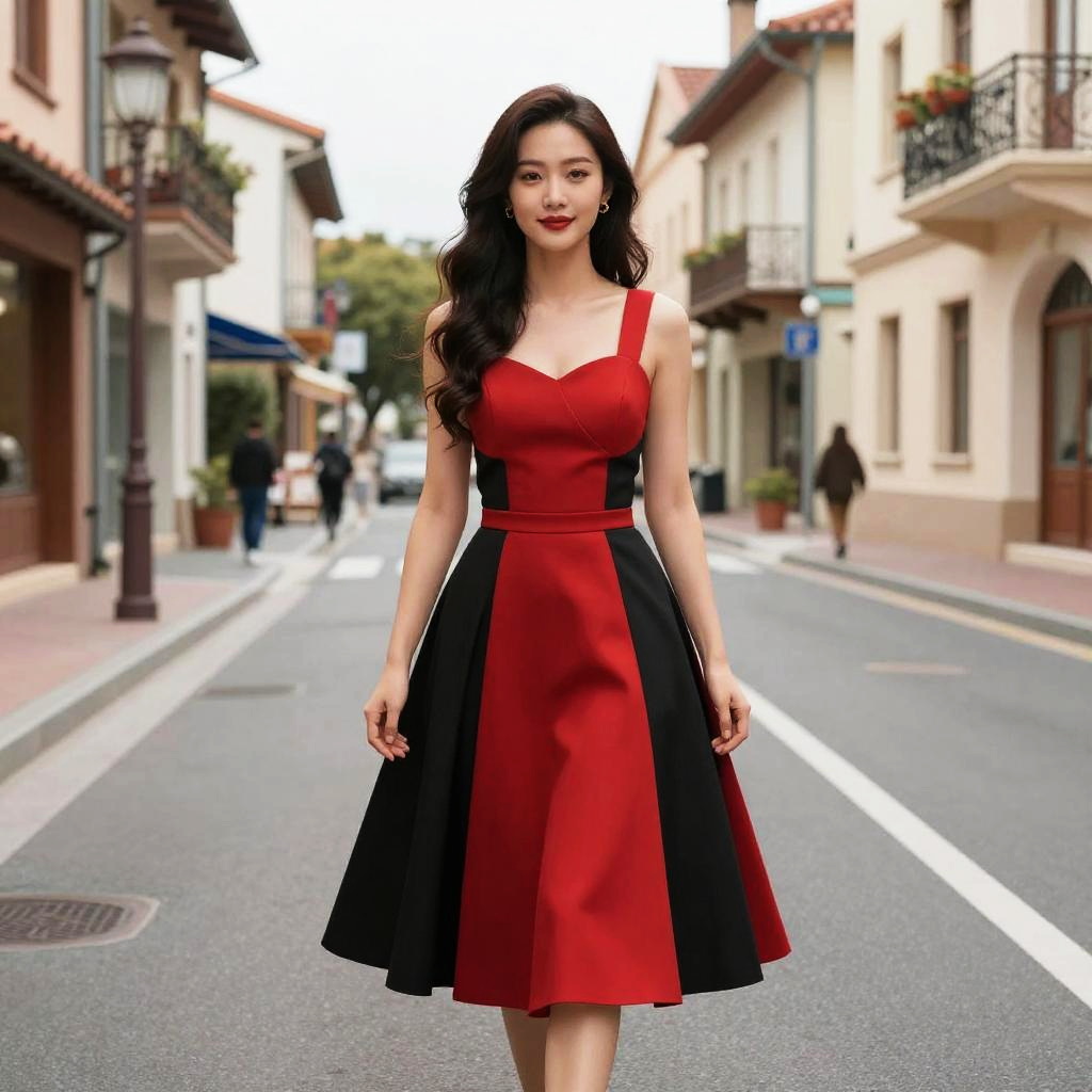 Elegant Asian woman wearing a sleeveless red dress with black vertical panels standing on a cobblestone street in a European city. The dress features thin straps and a fitted bodice. The background shows historic-style buildings and blurred pedestrians, enhancing the urban outdoor setting.