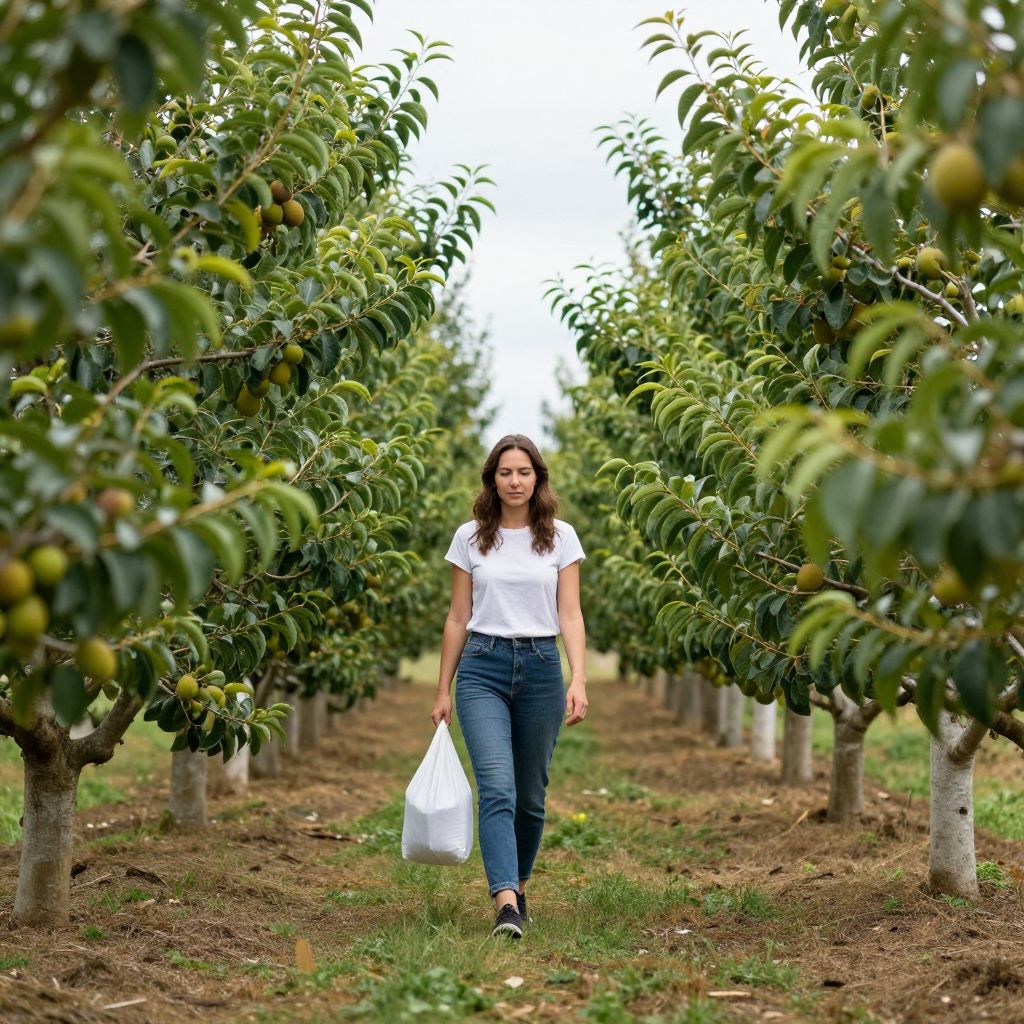 Woman walking through rows of lush green fruit trees, carrying a white bag, showcasing regenerative agriculture practices in a serene orchard setting.