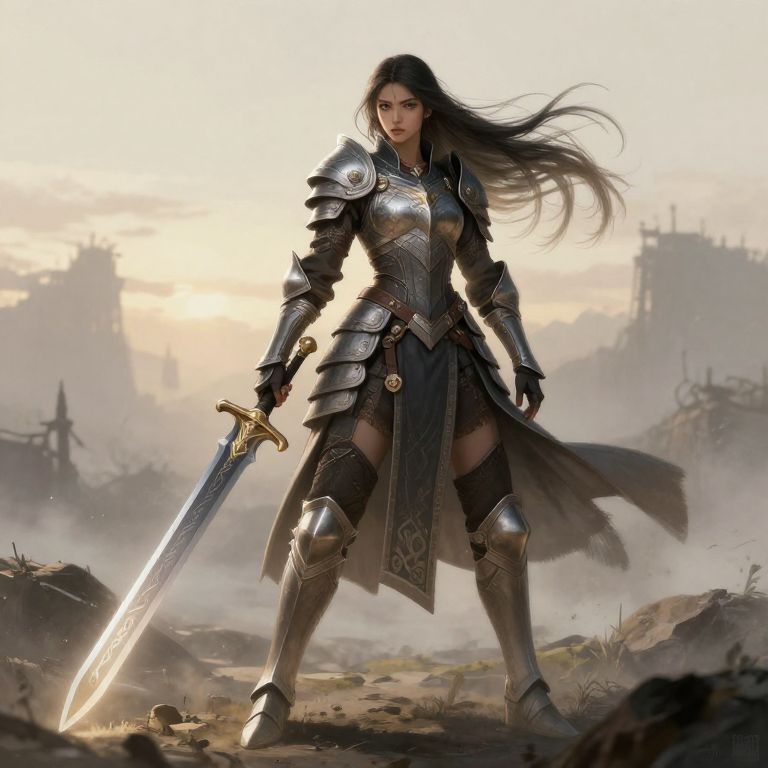 Digital artwork of a fierce, dark-haired female warrior in silver armor, holding a glowing sword, standing in a misty, ruined battlefield.