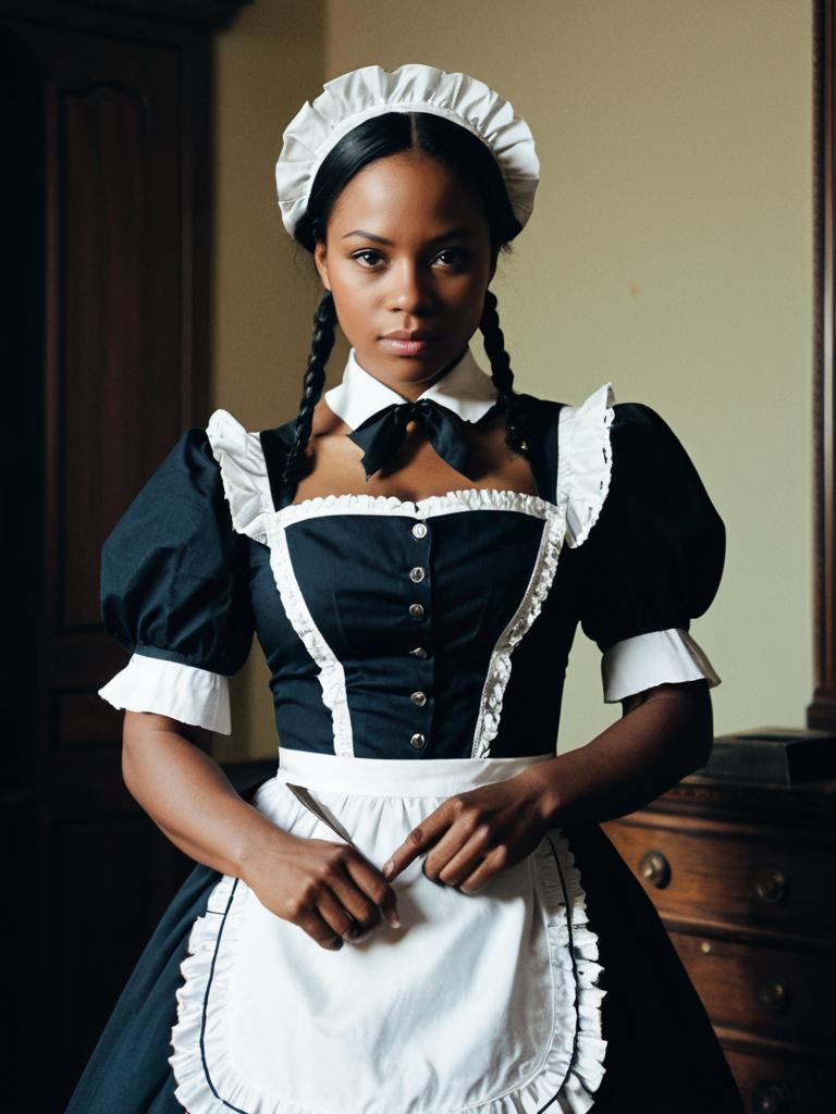 Woman in Django Unchained Maid Costume, photorealistic editorial cosplay photo