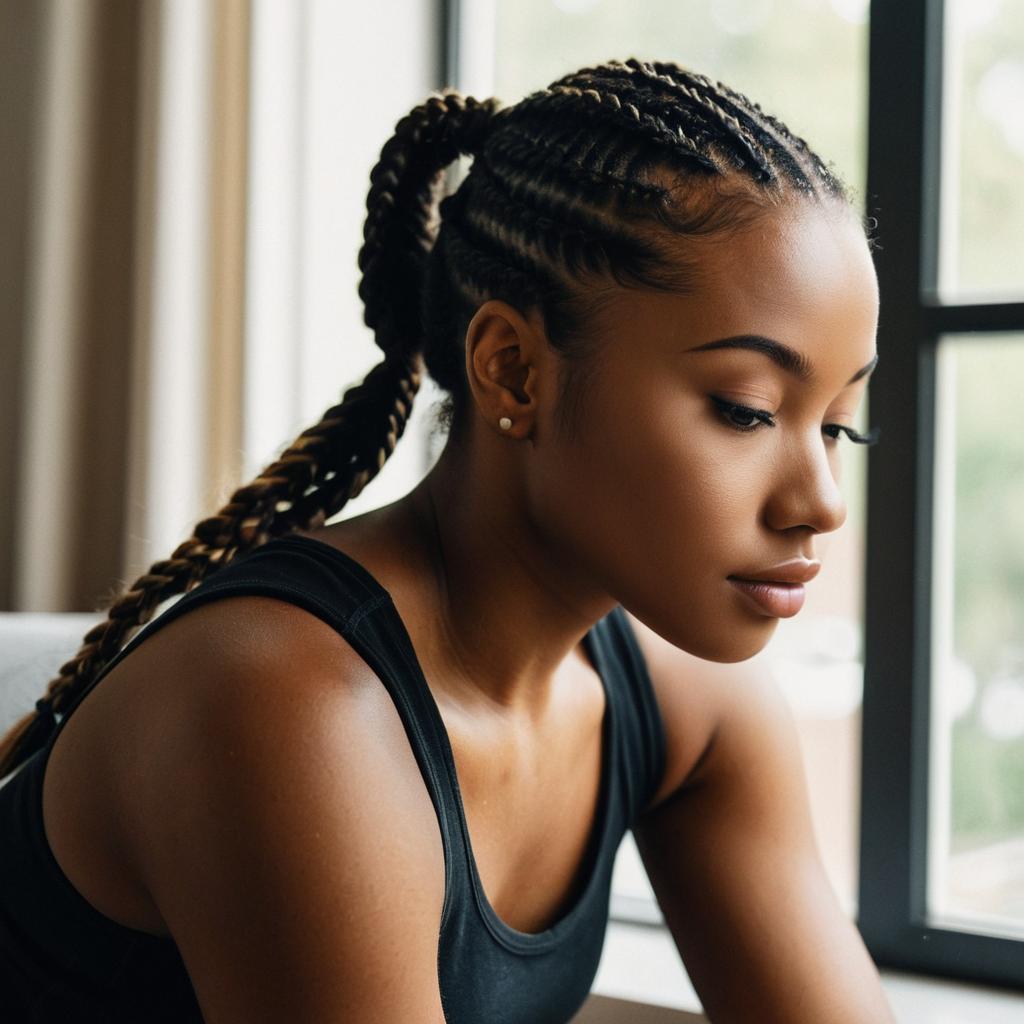 Soft-focus close-up portrait of a young fit woman sitting and leaning slightly forward, Black woman with braided ponytail and luminous skin, wearing a simple black tank top, hair pulled back into a messy side ponytail, gentle expression as she looks slightly downward past the camera, bright natural window light creating a creamy blurred background, warm tones, lifestyle portrait photography