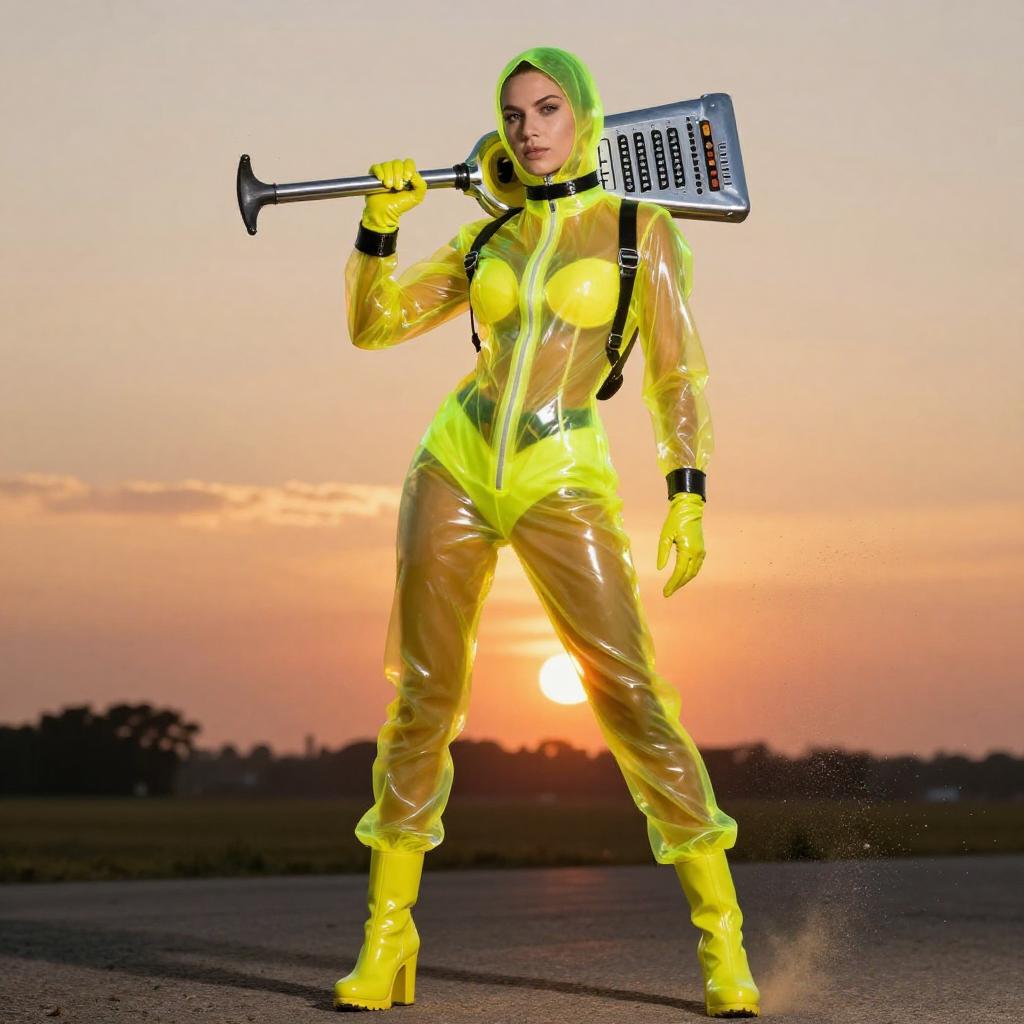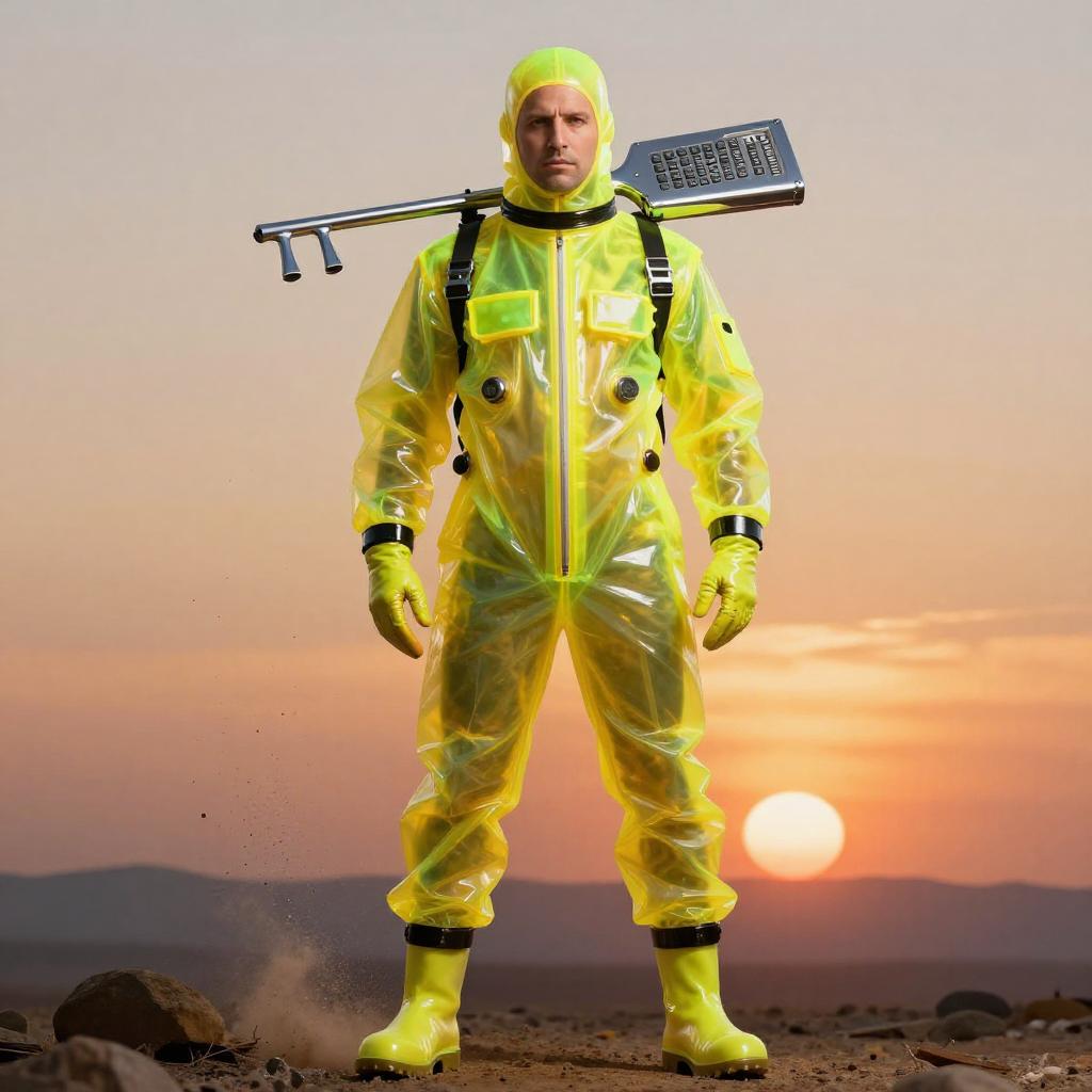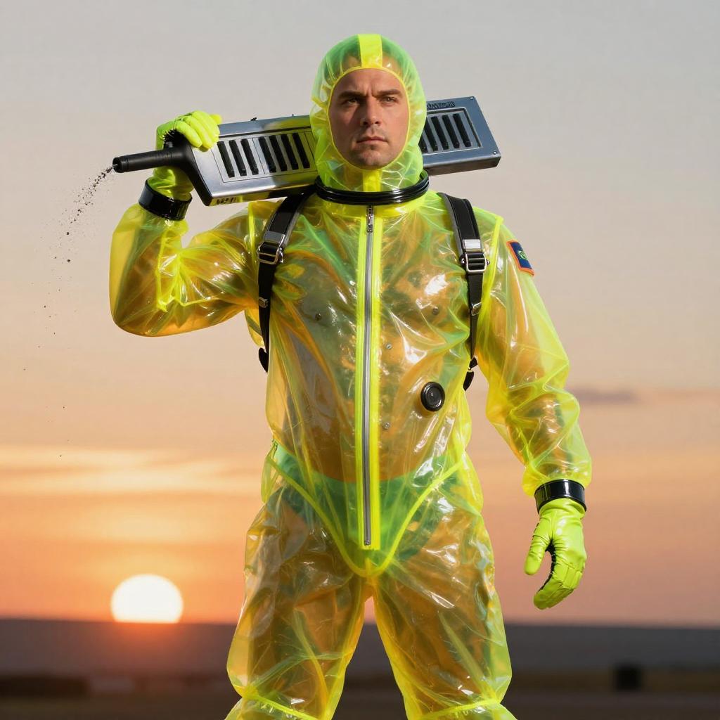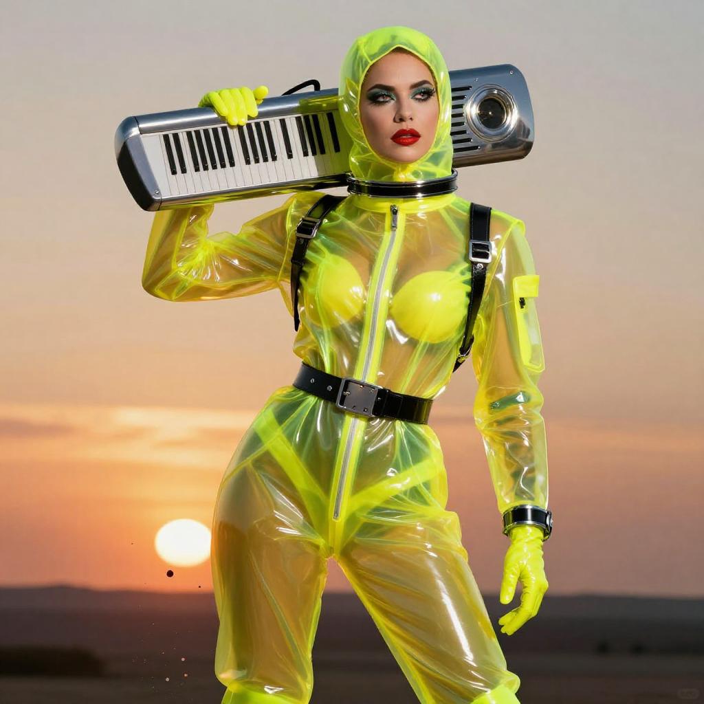 Charming average-height man wearing a super-glossy transparent fluorescent yellow latex spacesuit, standing in front of a sunset, eroding into particles, inspired by Versace, carrying a chrome keytar over his back