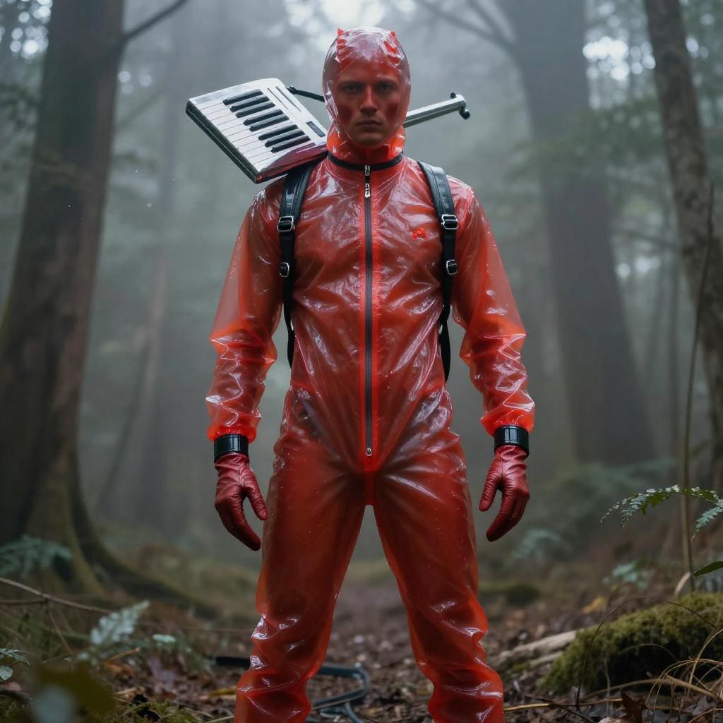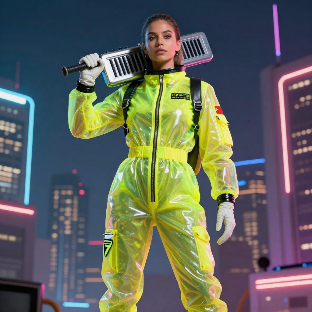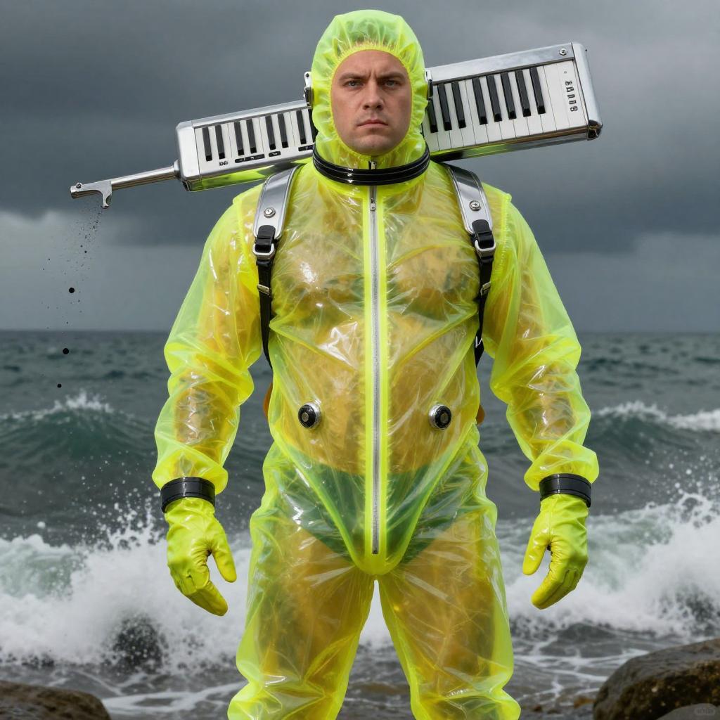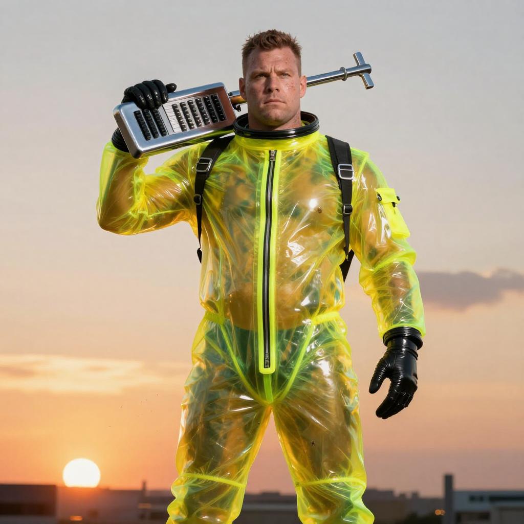 Charming average-height man wearing a super-glossy transparent fluorescent yellow latex spacesuit, standing in front of a sunset, eroding into particles, inspired by Versace, carrying a chrome keytar over his back