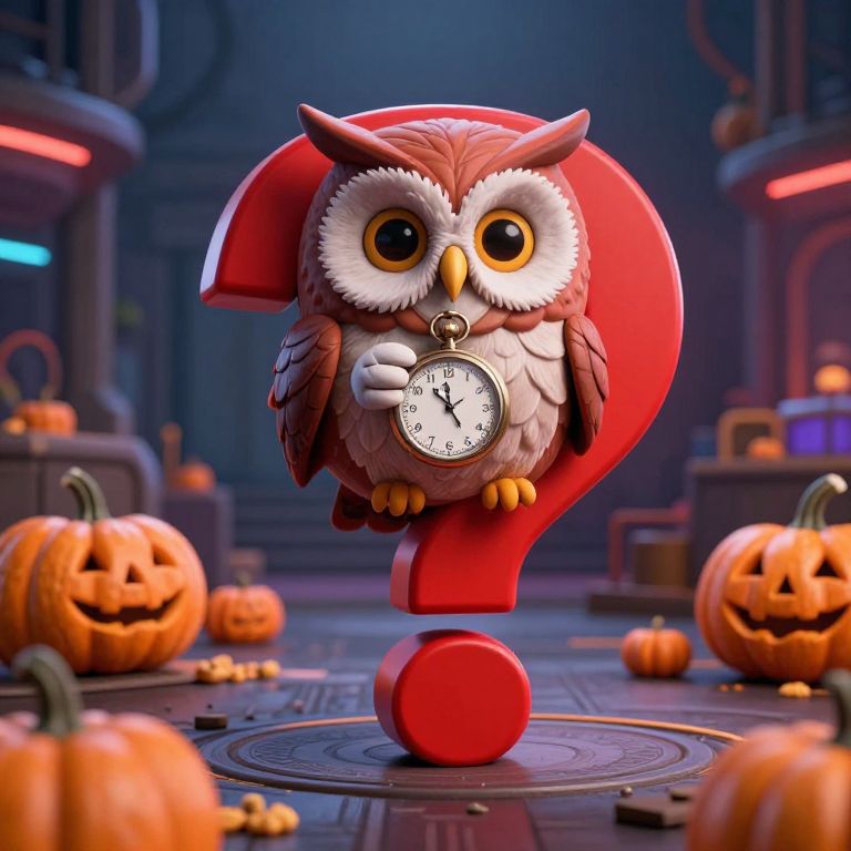 A whimsical 3D-rendered scene depicts an elderly owl perched inside a large red question mark, holding a pocket watch, as it presides over a surreal arena filled with orange pumpkins and dramatic lighting, evoking a blend of fantasy and cyberpunk aesthetics.