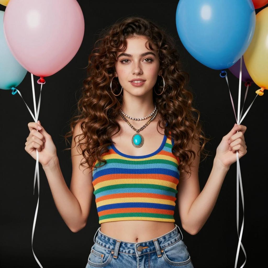 Portrait of a young woman with long curly brown hair wearing a multicolored striped crop top and blue jeans. She accessorizes with large hoop earrings and layered necklaces, including a turquoise pendant. Holding colorful balloons in both hands, she poses against a black background showcasing a vibrant retro, groovy style.