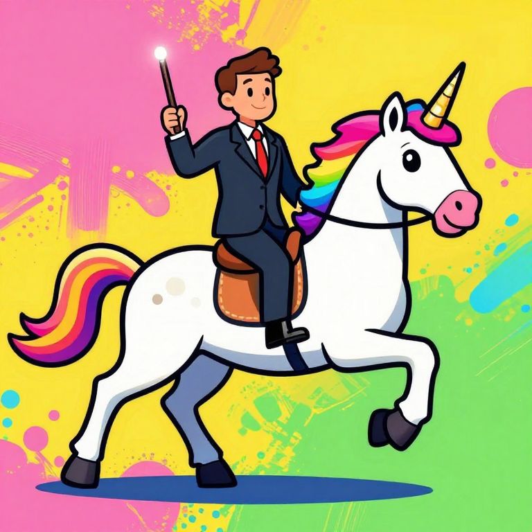 The image depicts a vibrant and whimsical scene featuring a cartoon-style venture capitalist riding a colorful unicorn. The unicorn, with its rainbow mane and tail, is depicted in a dynamic, galloping pose, adding a sense of motion and energy to the composition. The venture capitalist, dressed in a suit and tie, holds a wand in one hand, exuding a sense of authority and control over the situation. The background is a mix of bold, abstract shapes and splashes of color, including shades of pink, yellow, and green, which complement the unicorn's vibrant hues. The overall composition is playful and imaginative, blending elements of fantasy with a touch of graffiti art, creating a visually striking and engaging piece.