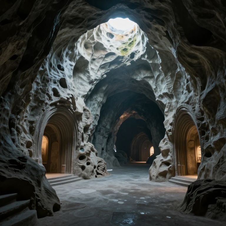 An underground city thrives inside a colossal geode, where light refracts in every hall and shadows possess their own intricate architecture.