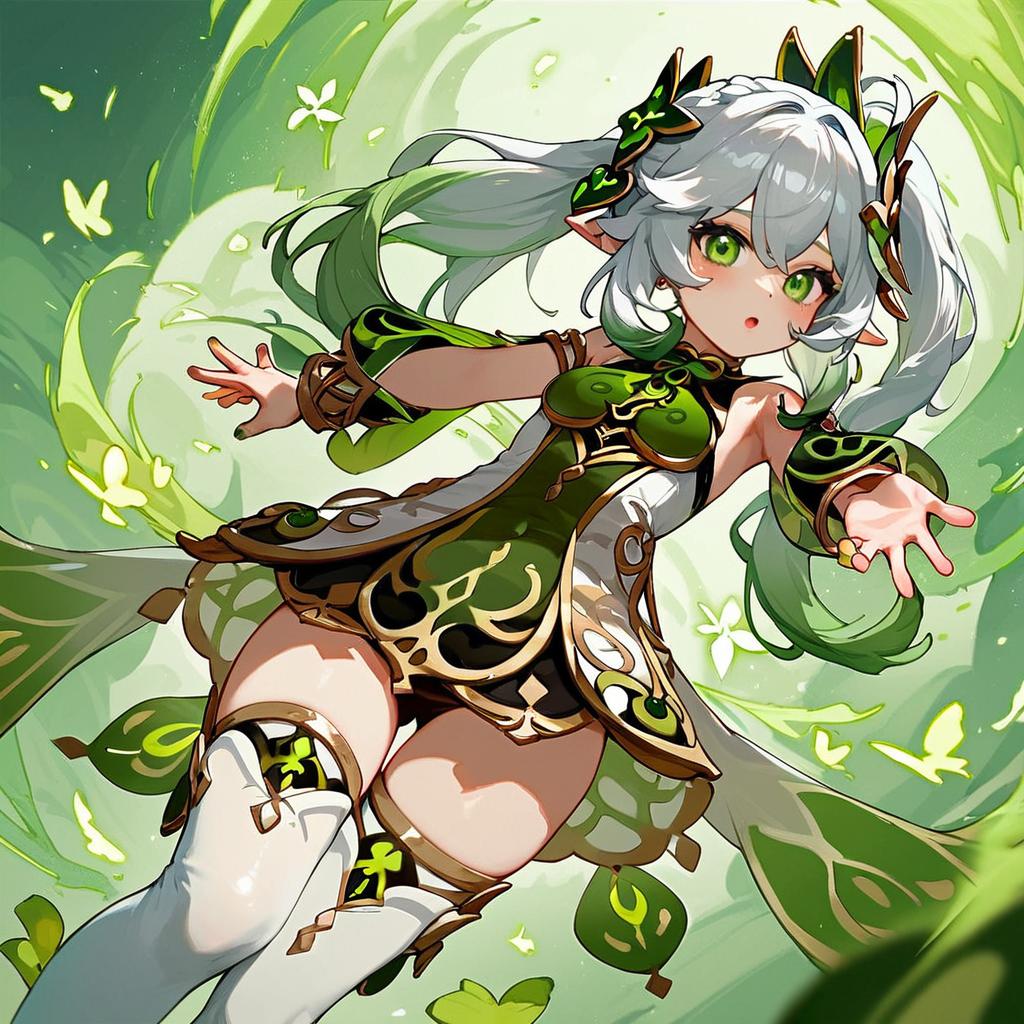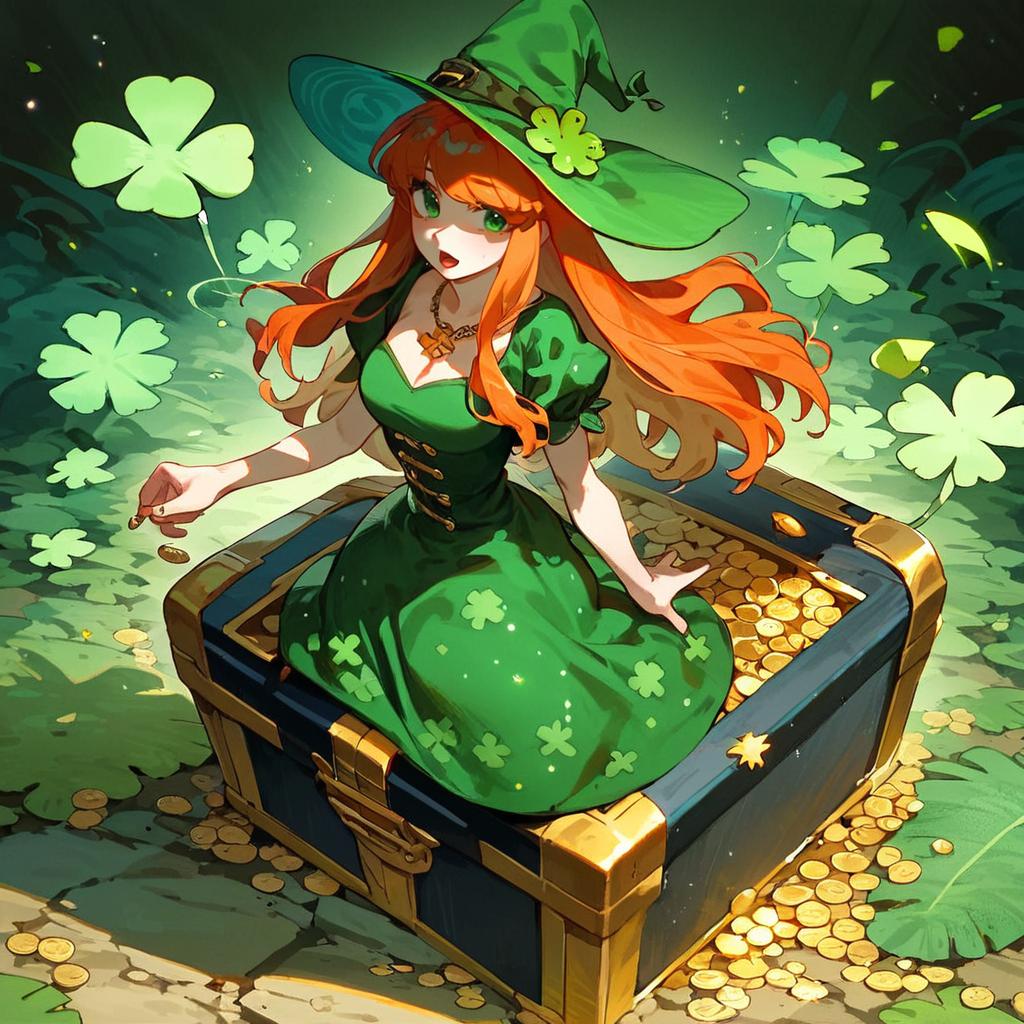 A chibi-style fantasy creature with white skin, golden solid circle eyes, and green hair, wearing a green top hat decorated with clovers and a green suit with gold accents. The character is surrounded by floating four-leaf clovers and has exaggerated large ears, black footwear, and a bow tie, embodying a whimsical leprechaun theme.