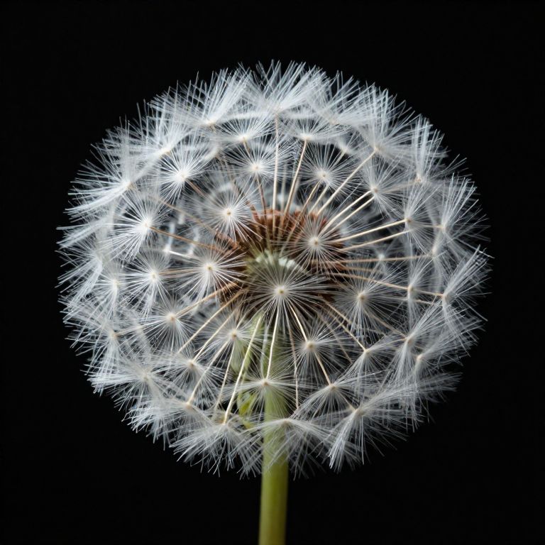 Close-up photograph of a white dandelion seed head against a black background, highlighting the delicate, radiating seeds and central brown core.
