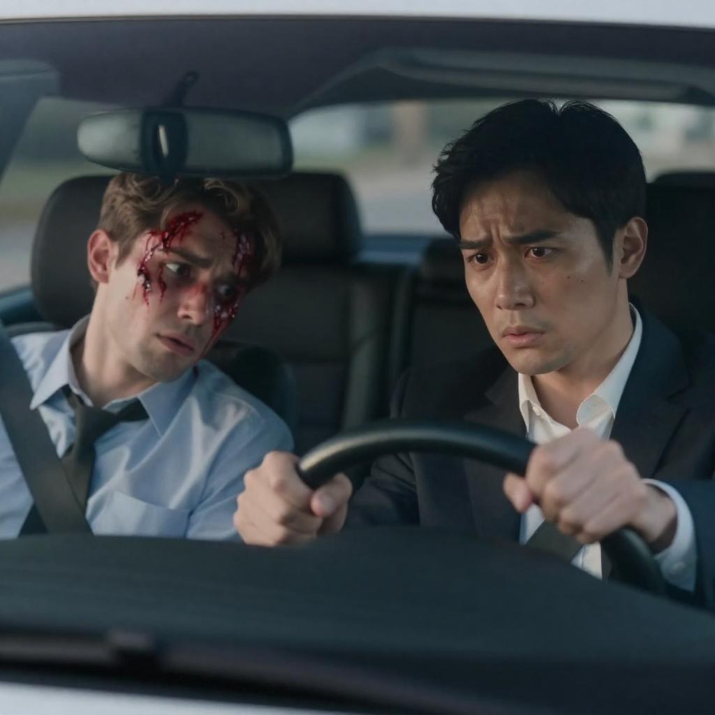 Photograph of two men inside a car. The male driver, dark-haired with a serious expression, grips the steering wheel tightly. The passenger, also male, has a distressed look with visible blood on his face, suggestive of an injury. Both men are wearing casual clothing and seat belts. The car windshield is slightly fogged, and the background shows a blurred road, adding to the dramatic and tense atmosphere of the scene.