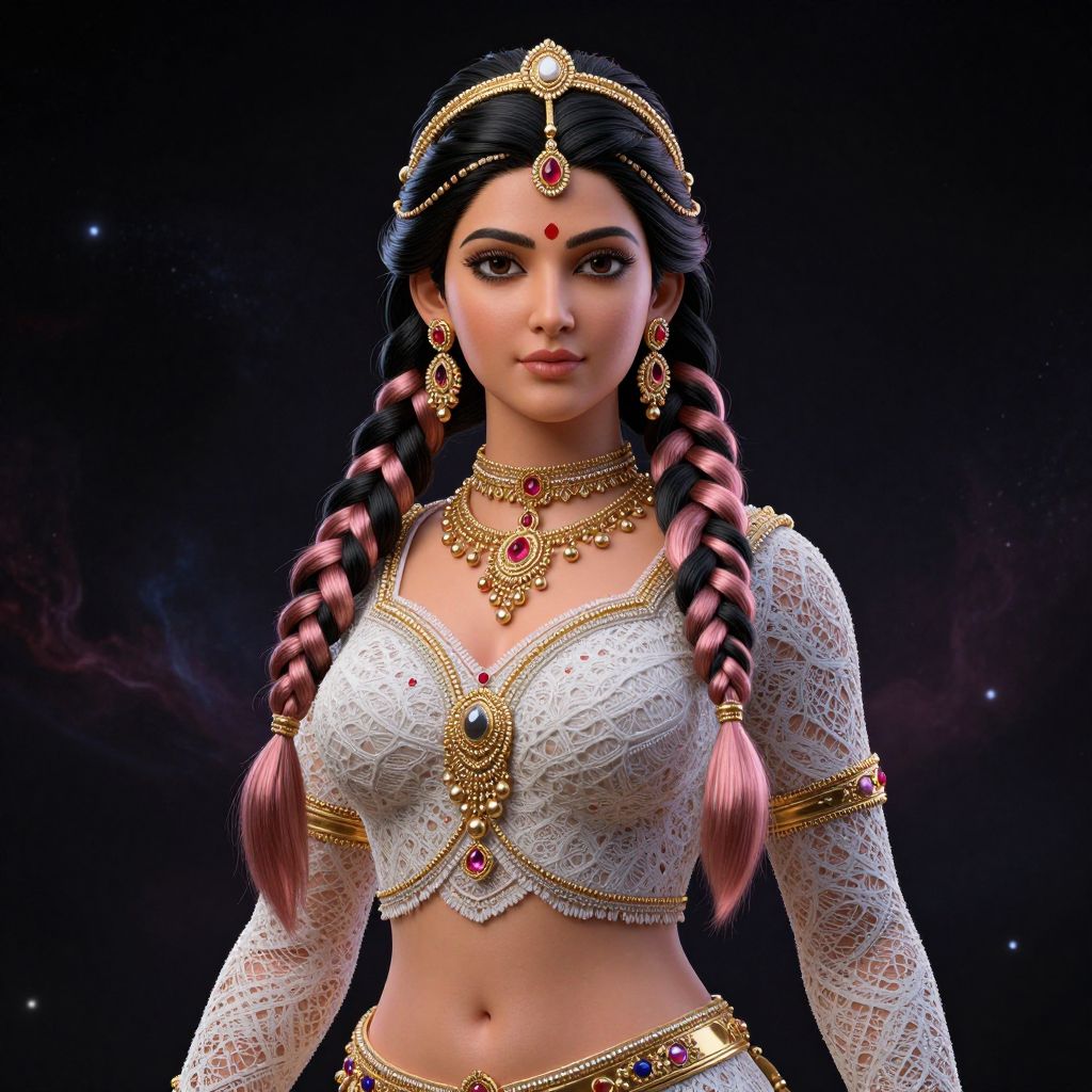A highly detailed, ultra-realistic 3D rendering of a beautiful porcelain Goddess Durga woman, resembling Priyanka Chopra, adorned in a lace dress and intricate gold jewelry, with long black and rose gold braids, set against a dark, nebula-like background.