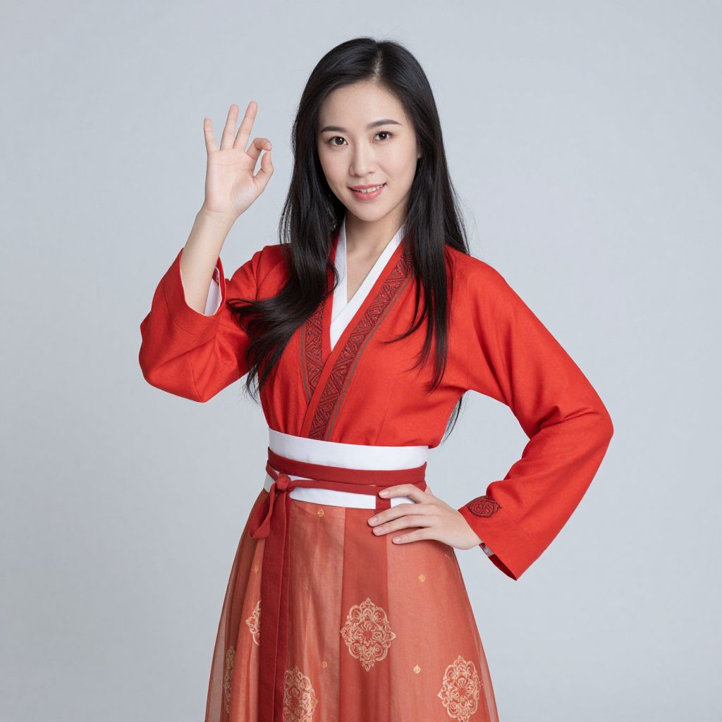 Photograph of an Asian woman with long black hair, wearing a vibrant red traditional Korean hanbok. The top is a long-sleeved, V-neck blouse with intricate gold embroidery along the neckline and sleeves. She has a white belt tied around her waist, and the skirt is semi-transparent with gold floral patterns. She stands against a plain white background, smiling, with her right hand raised in a wave and her left hand resting on her hip. Her makeup is subtle, and she has a light skin tone. The overall style is elegant and traditional.