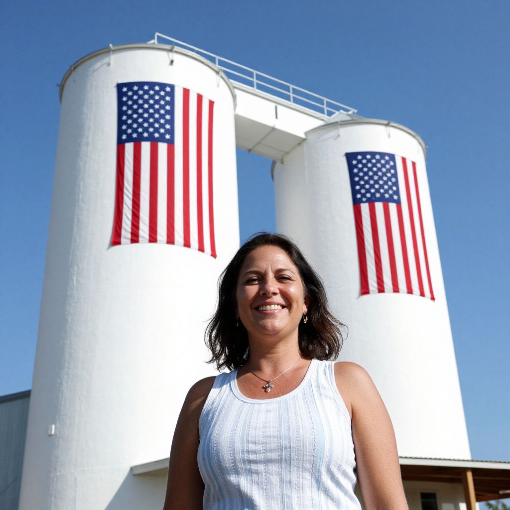 Woman smiling in front of two iconic white silos adorned with American flags during the 2017 Silobrations event at Magnolia Market in Waco, Texas.
