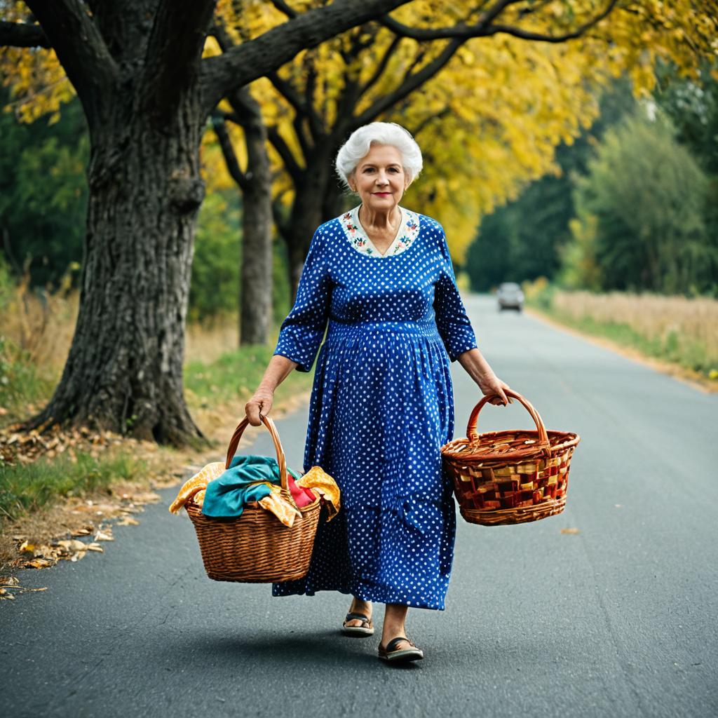 Funny grandma costume,old woman, old, tree, solo, basket, 1girl, walking, multicolored clothes, old man, outdoors, holding basket, dress, multicolored dress, blurry, full body, road, holding