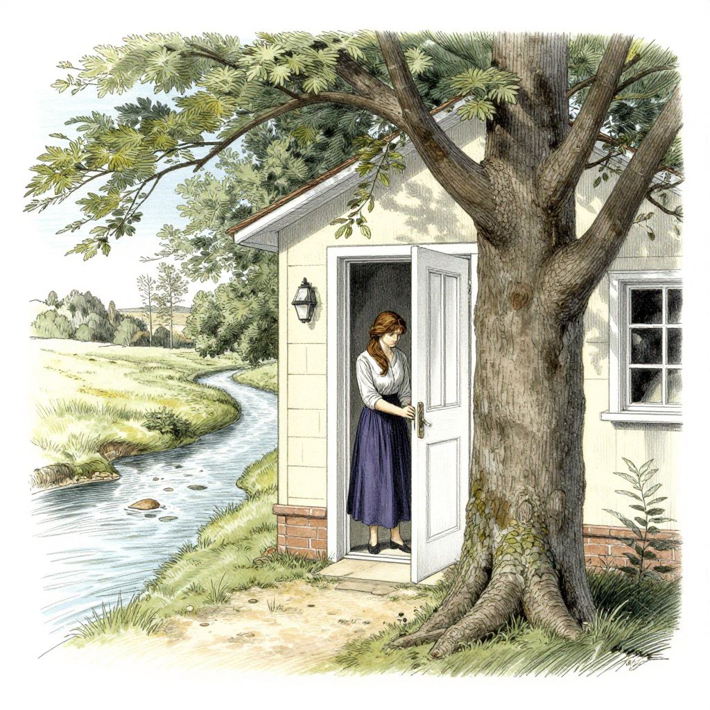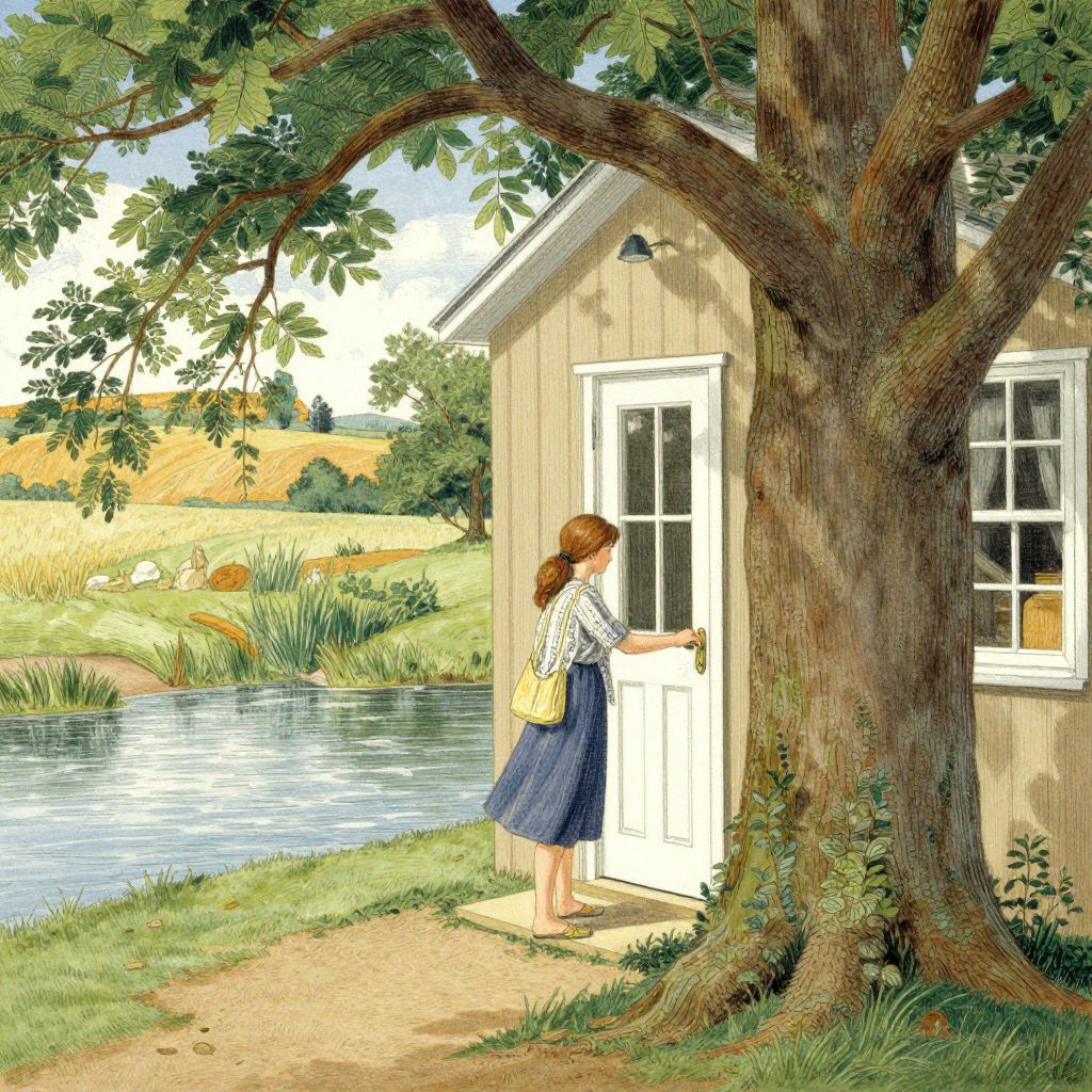 Illustration of a brown-haired woman in a blue skirt and white blouse opening the door of a small wooden shed by a serene lake, surrounded by lush