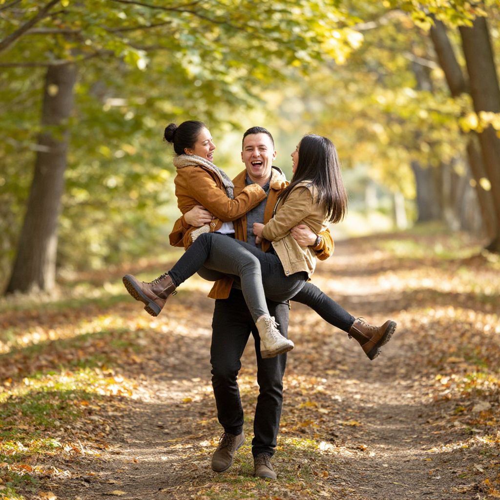 A vibrant photograph of a playful autumn scene. A man with short dark hair, wearing a brown jacket and black pants, joyfully carries two women. The woman on his left has dark hair in a bun, a brown jacket, and gray pants, while the woman on his right has dark hair down, a tan jacket, and brown boots. They stand on a leaf-strewn path surrounded by sunlit, green and yellow trees. The background is softly blurred, emphasizing the lively, joyful moment.