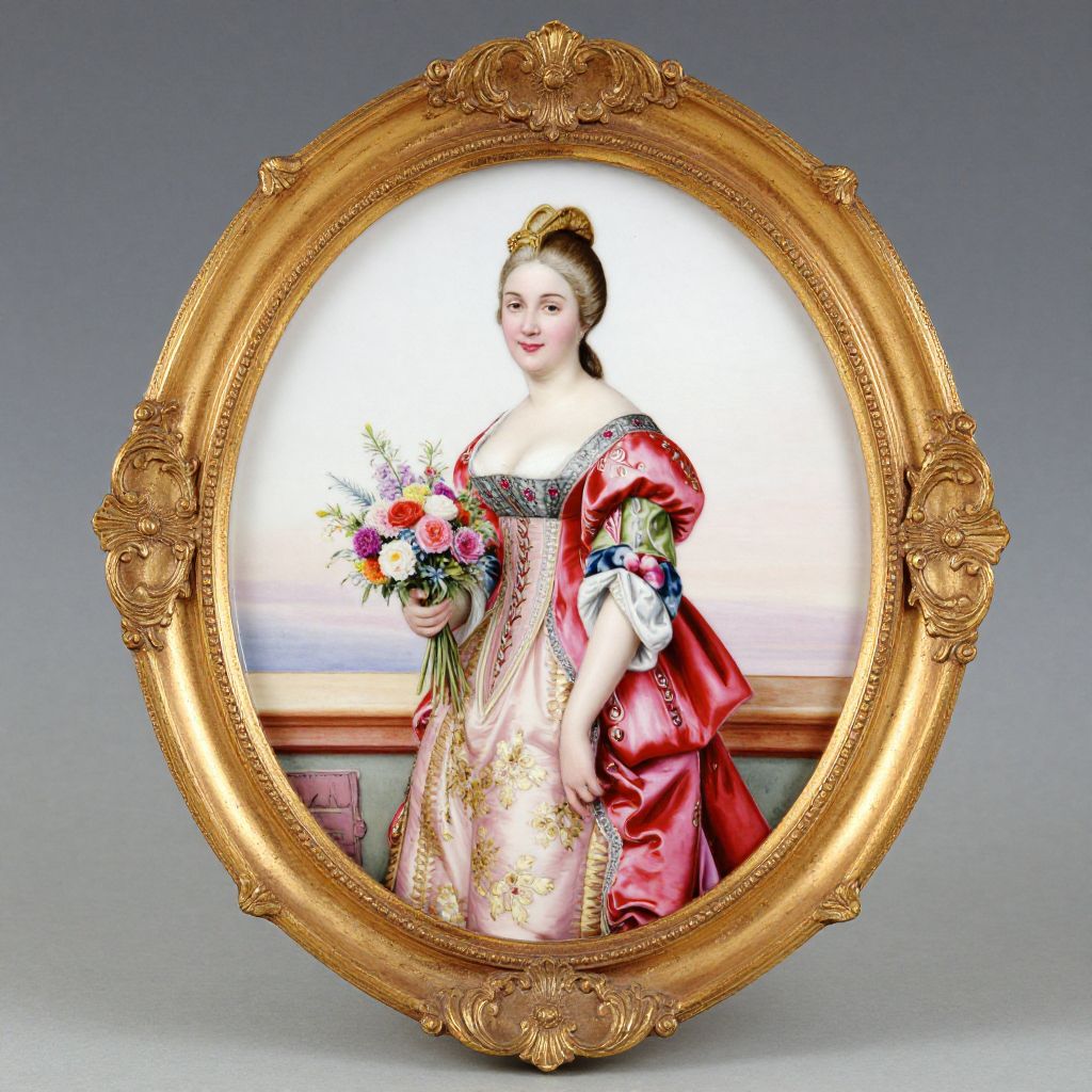 Dresden Hand-Painted Porcelain Plaque by the 19th Century Continental School, featuring a delicately rendered portrait of a woman in a vibrant red and pink gown, gracefully holding a bouquet of colorful flowers, encased in an ornate gold frame with intricate detailing.